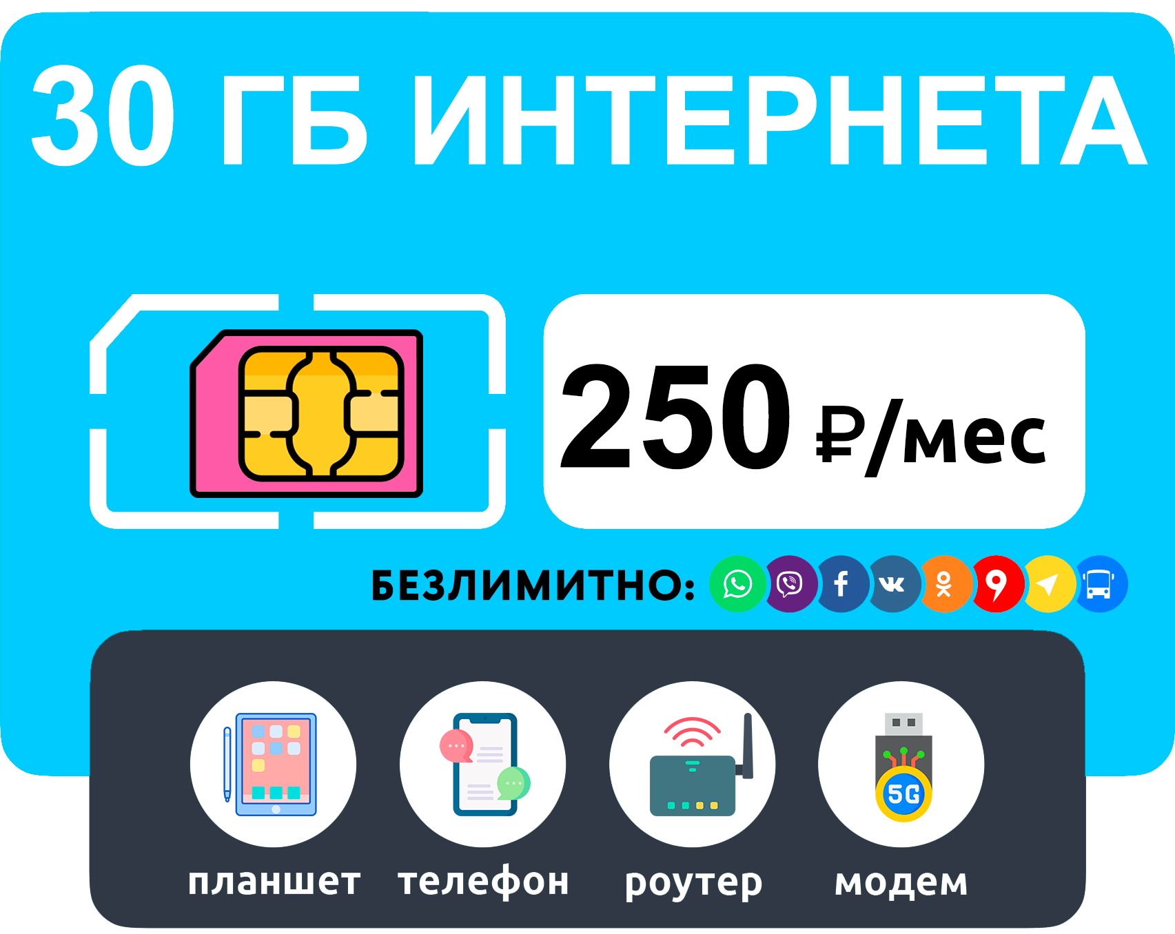 Купить SIM-карта с тарифом 30 гб интернета 3G/4G + раздача Wi-Fi с любого устройства + безлимитные мессенджеры/соц сети (по всей России) за 250 руб/мес