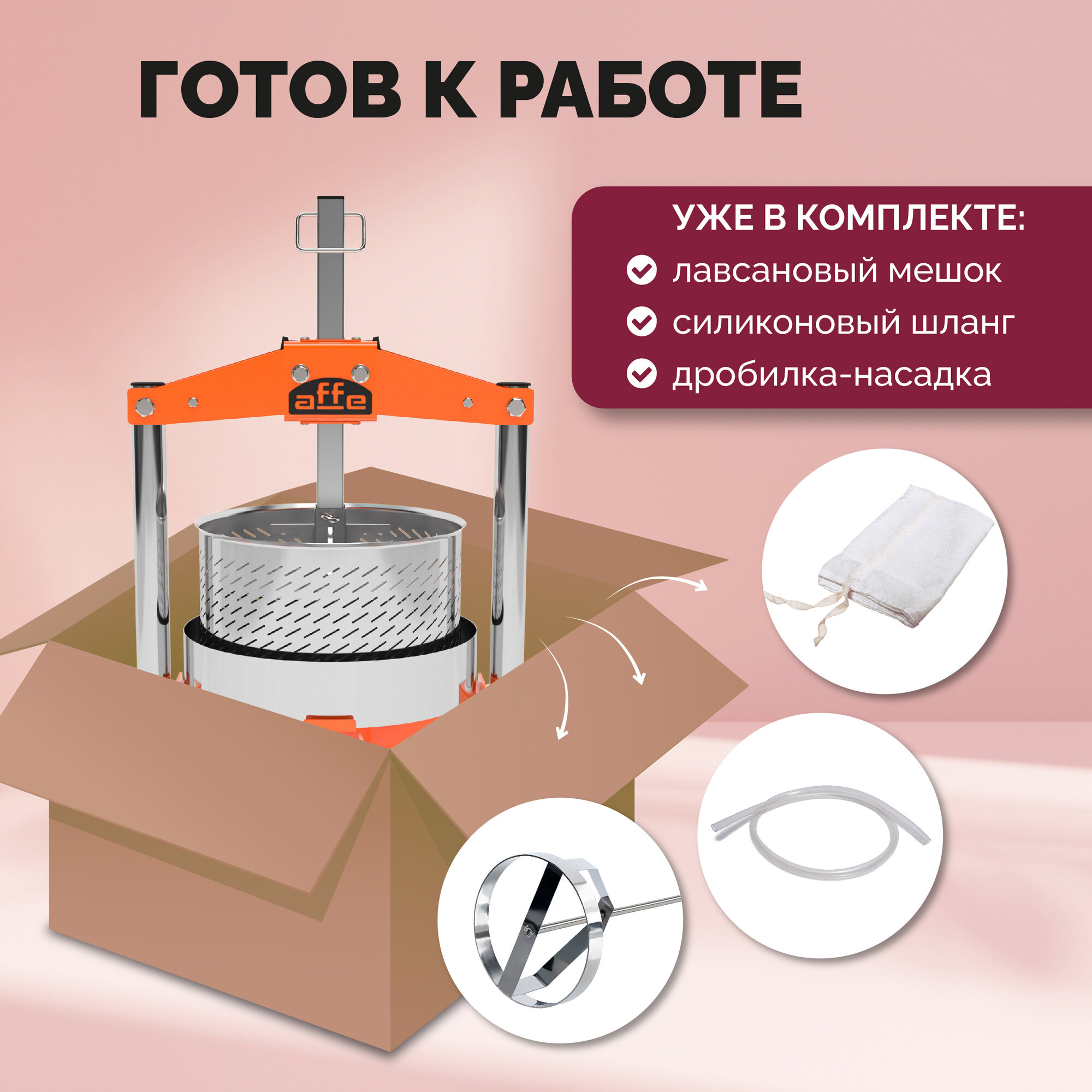 | Подробная комплектация | Автоматический пресс для сока 12 л, дробилка, мешок |