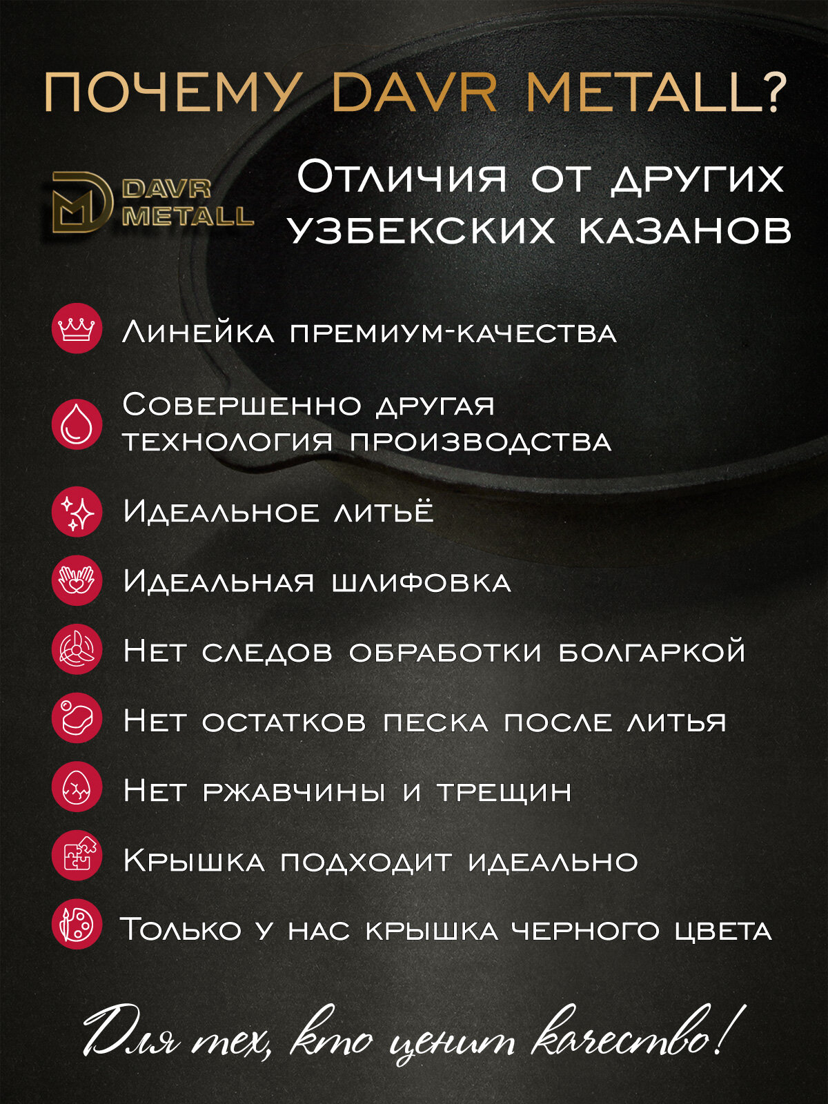 | Дополнительная информация | Казан чугунный узбекский DavrMetall 6 л плоское дно с алюминиевой крышкой |