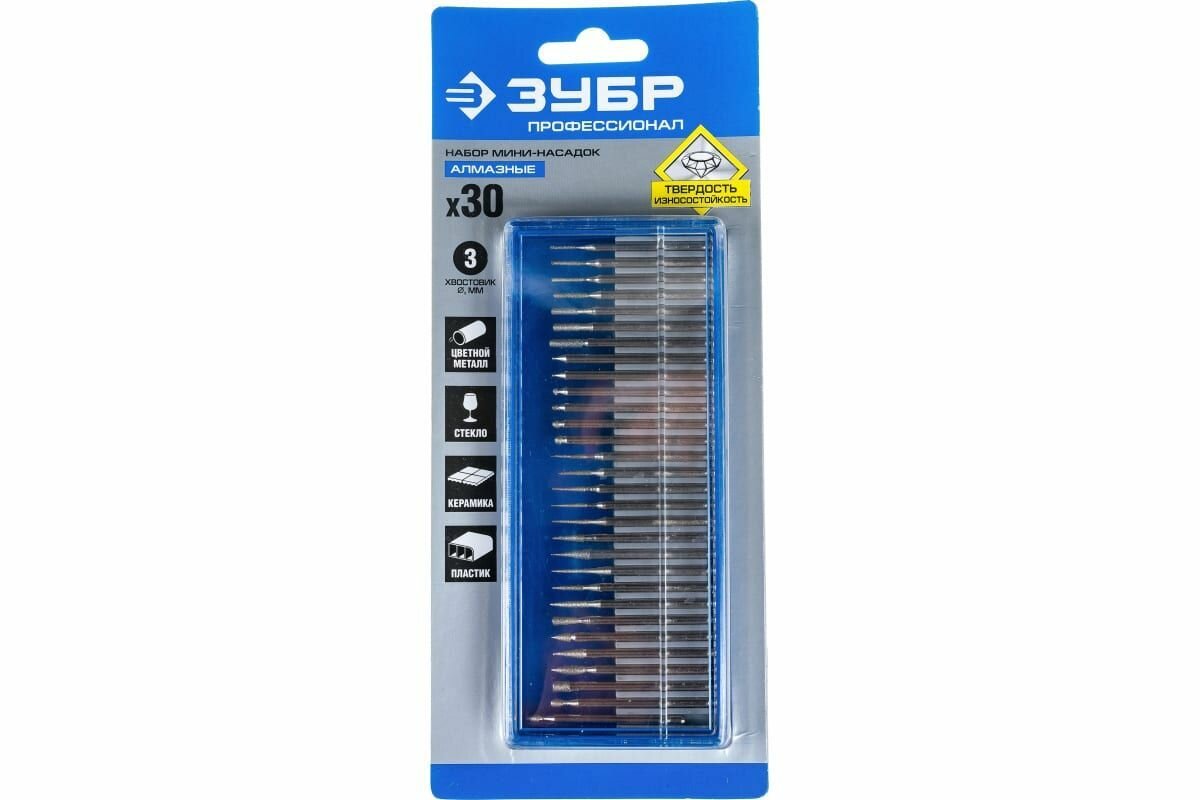 ЗУБР 30 шт, хвостовик d 3 мм, Р 150 - 180, набор алмазных мини-насадок для гравера, Профессионал (33383-H30)