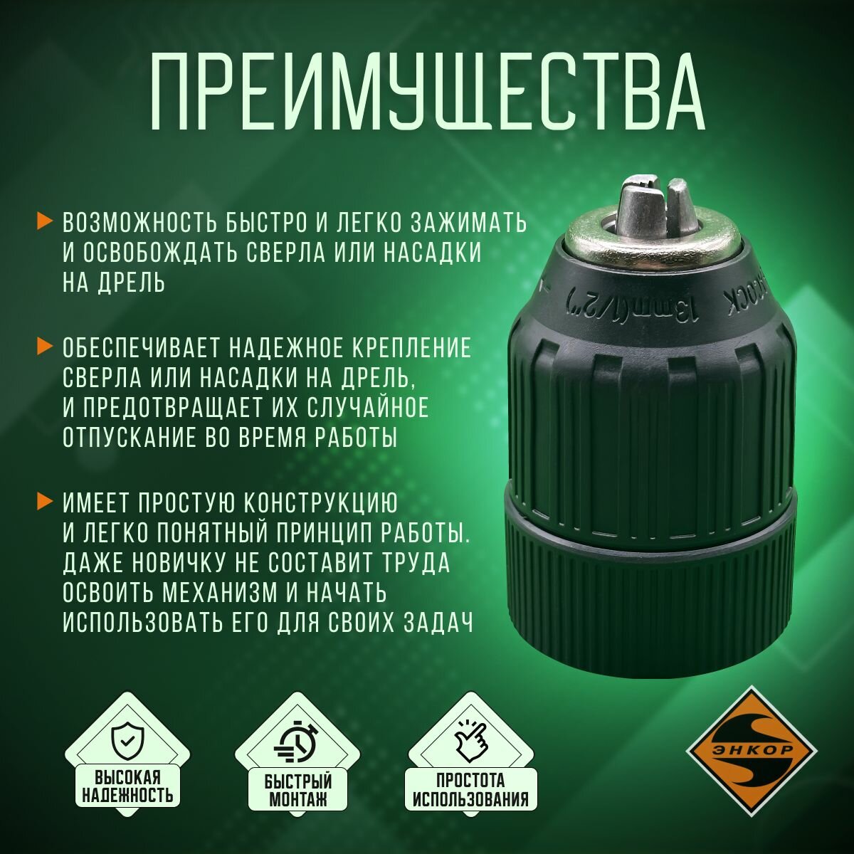 Патрон сверлильный быстрозажимной (БЗП), зажимаемый диаметр 2-13 мм, посадка - резьба 1/2"- 20 UNF Энкор 23527 интересное: