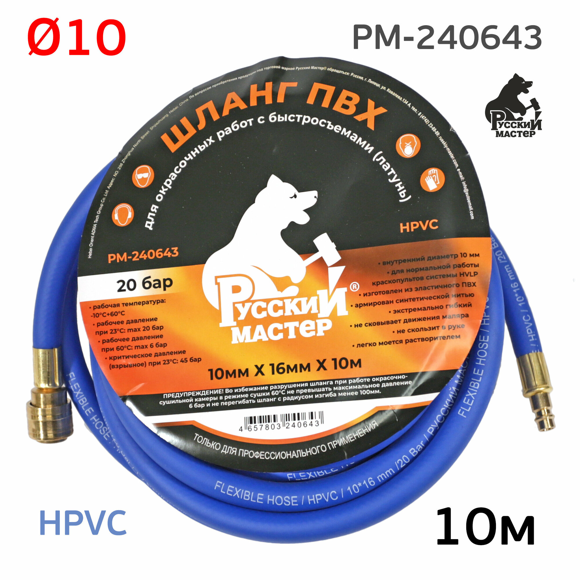 Шланг покрасочный РМ-240643 (10м; 10х16мм; синий; max 20 бар) HPVC, латунные быстросъемы интересное: