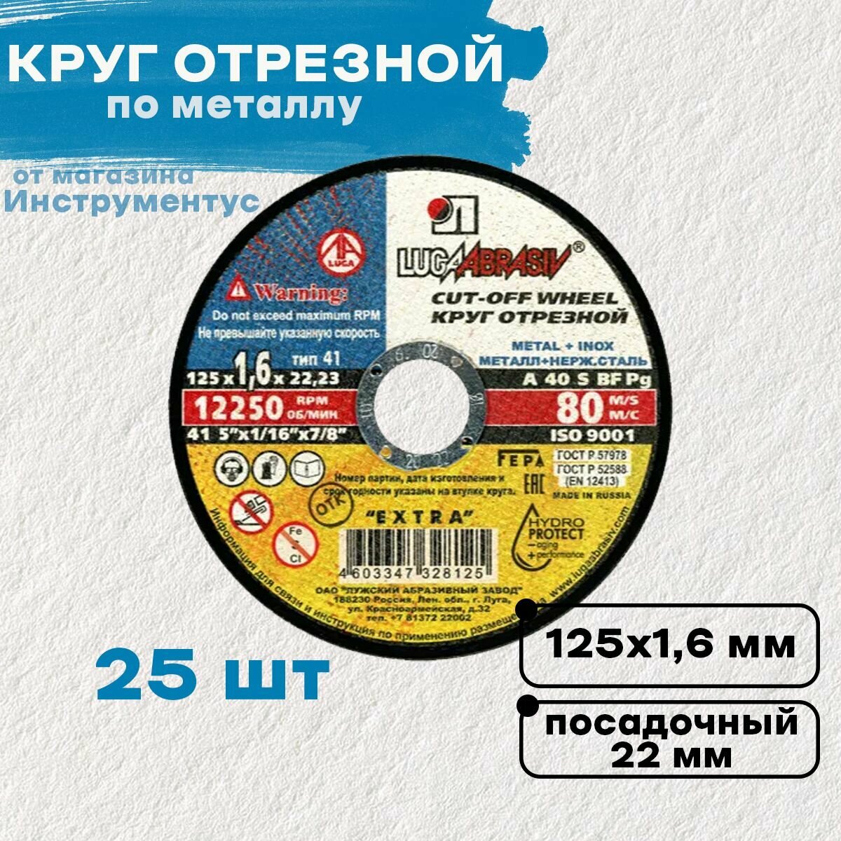 Круг отрезной 115x1.6x22 мм . по металлу+нержавейка LUGA ABRASIV 1шт.