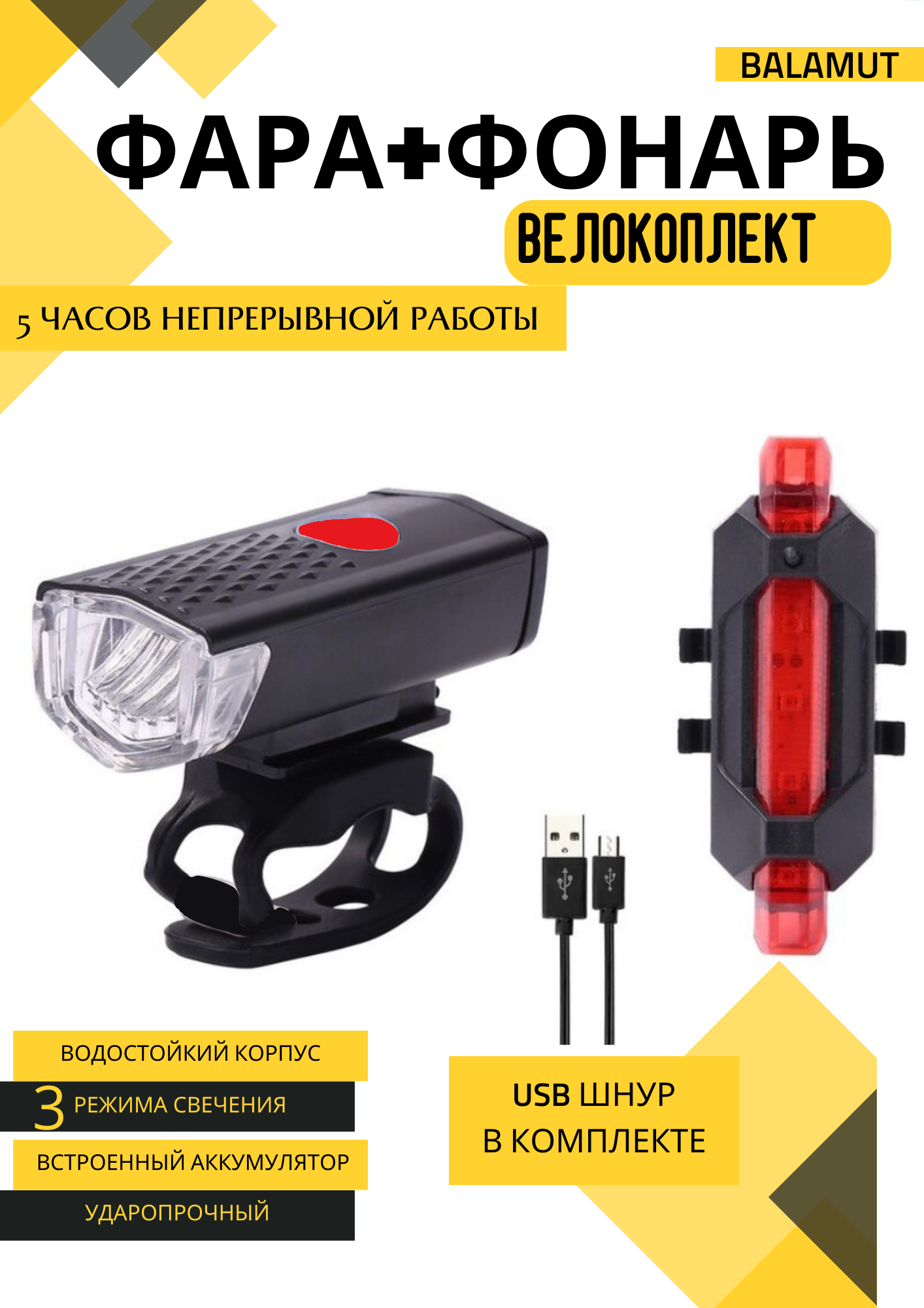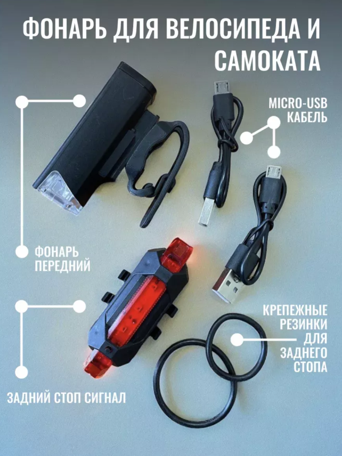 Фонарь велосипедный комплект (передний и задний), на аккумуляторе с креплением и USB зарядкой интересное: