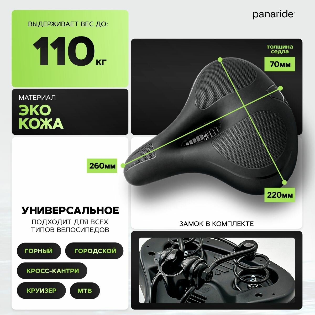 | Особенности конструкции | водонепроницаемое / седло с гелевыми вставками / седло с отверстием / седло с пружинами |