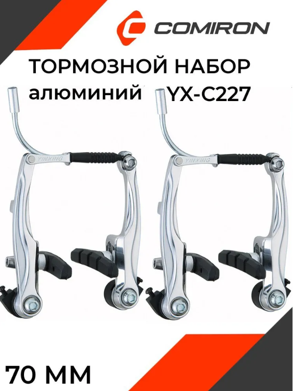 Купить Тормоза V-brake алюминиевые COMIRON YX-C227, 110мм, передний и задний (комплект),колодки 70мм, направляющая 90°, болт M6*20мм, резинка 45мм /уп 50/