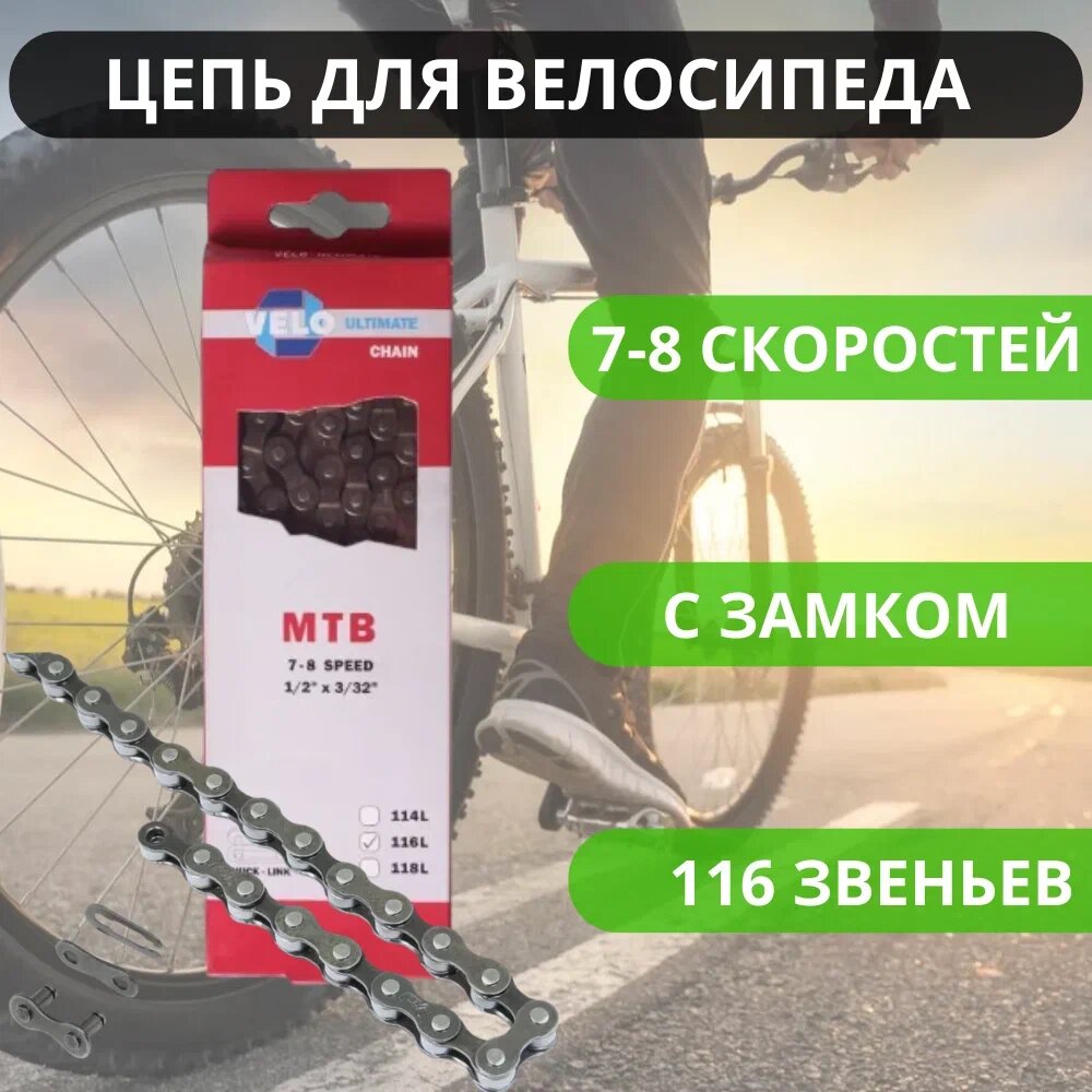 Цепь для спортивного велосипеда VELO на 7, 8 скоростей, 116 звеньев, с замком / Запчасти для велосипеда интересное: