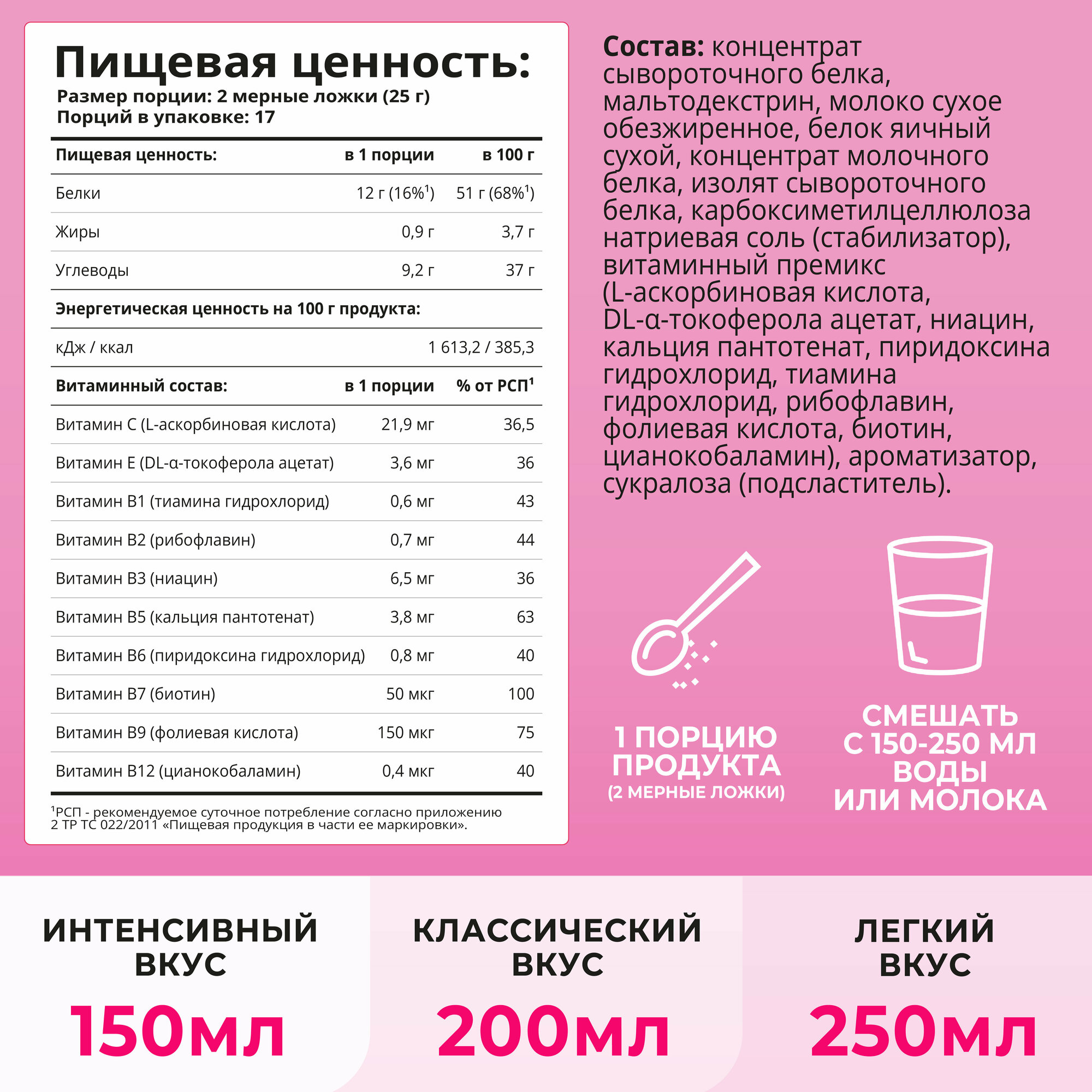 | Дополнительная информация | Состав: концентрат сывороточного белка, мальтодекстрин, молоко сухое обезжиренное, белок яичный сухой, какао-порошок, концентрат молочного белка, изолят сывороточного белка, карбоксиметилцеллюлоза натриевая соль (стабилизатор), витаминный премикс (L-аскорбиновая кислота, DL-α-токоферола ацетат, ниацин, кальция пантотенат, пиридоксина гидрохлорид, тиамина гидрохлорид, рибофлавин, фолиевая кислота, биотин, цианокобаламин), ароматизатор, сукралоза (подсластитель). |