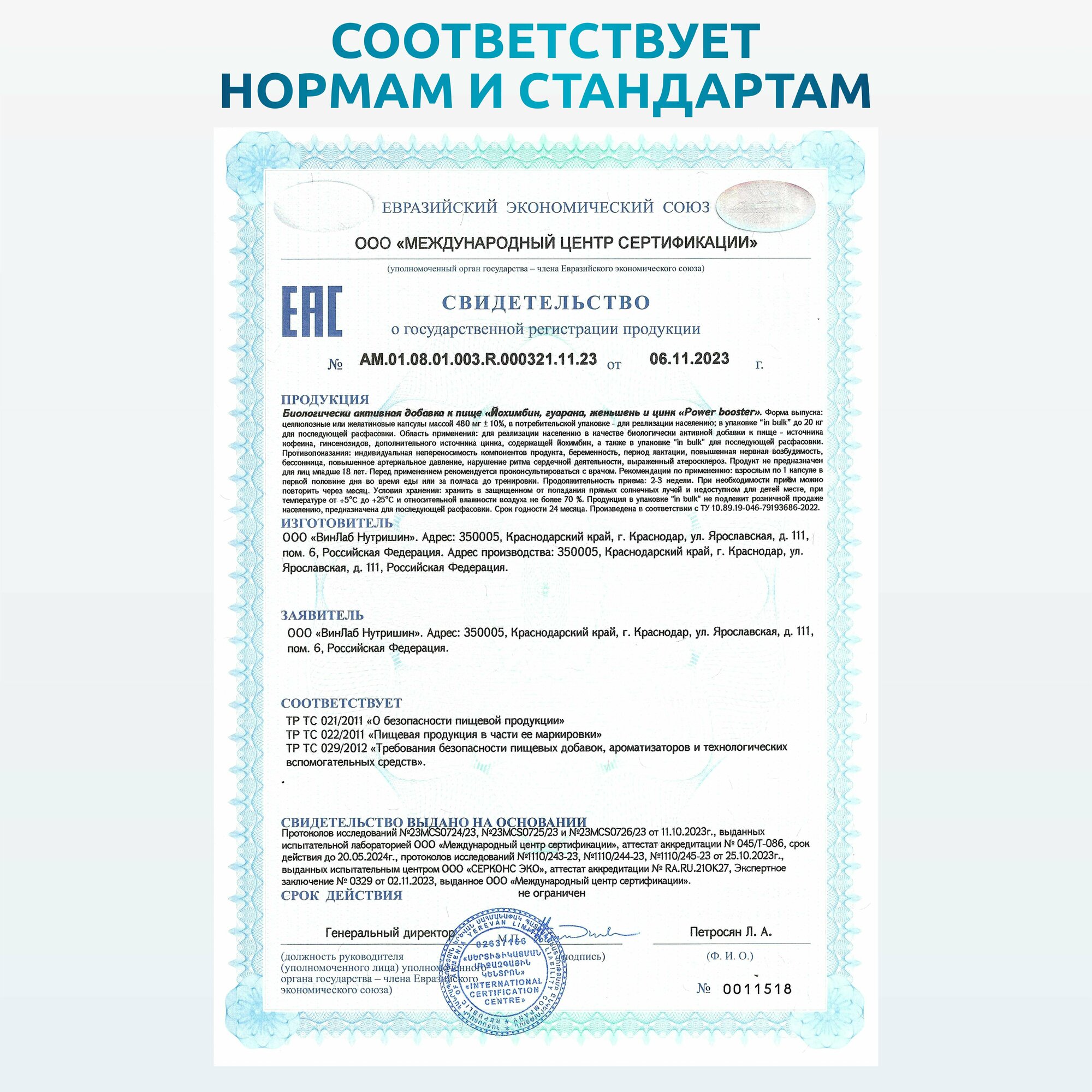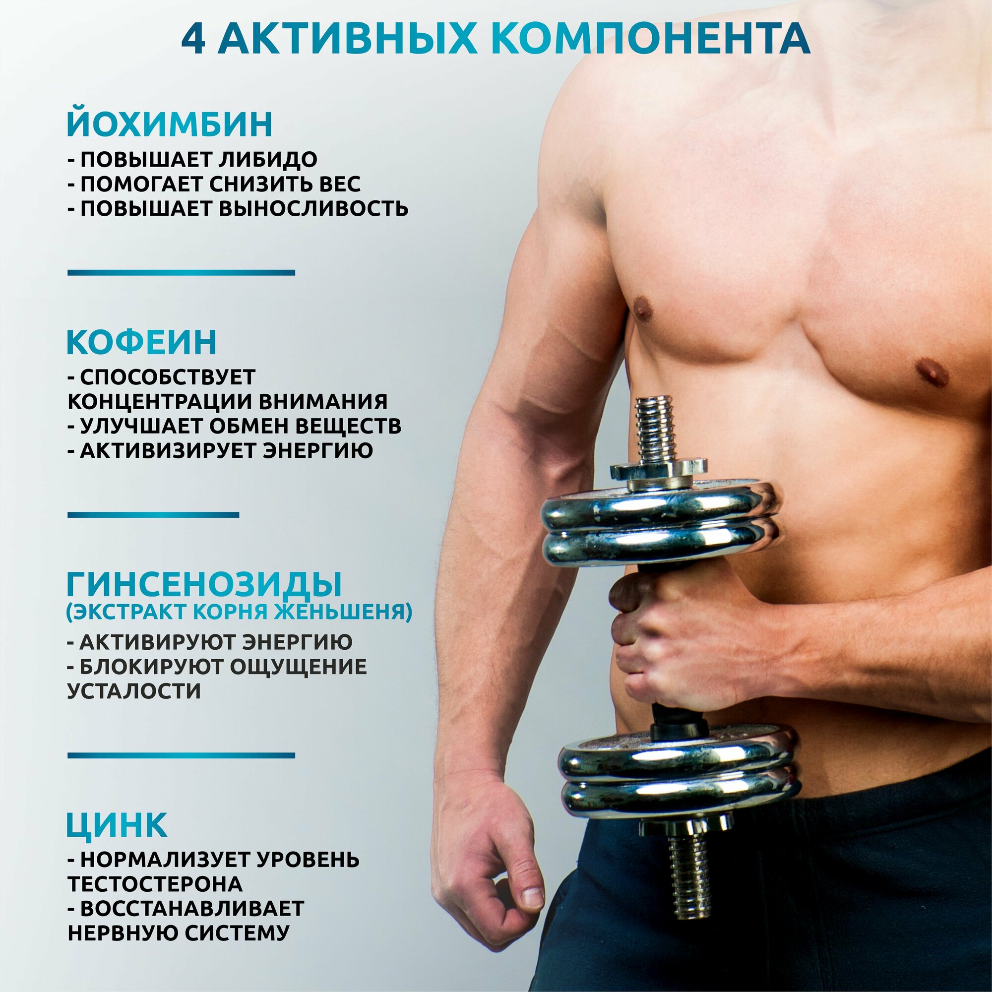 | Дополнительная информация | Состав: экстракт плодов гуараны (кофеин), экстракт корня женьшеня (гинсенозиды), капсула целлюлозная (гидроксипропилметилцеллюлоза), экстракт коры йохимбе (йохимбин), цитрат цинка. |