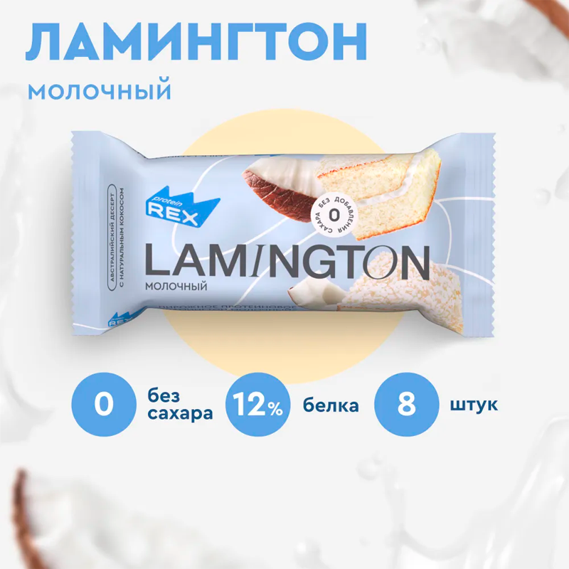 Протеиновые пирожные без сахара ProteinRex Ламингтон Молочный 8 шт х 50 г, 190 ккал, спортивное питание