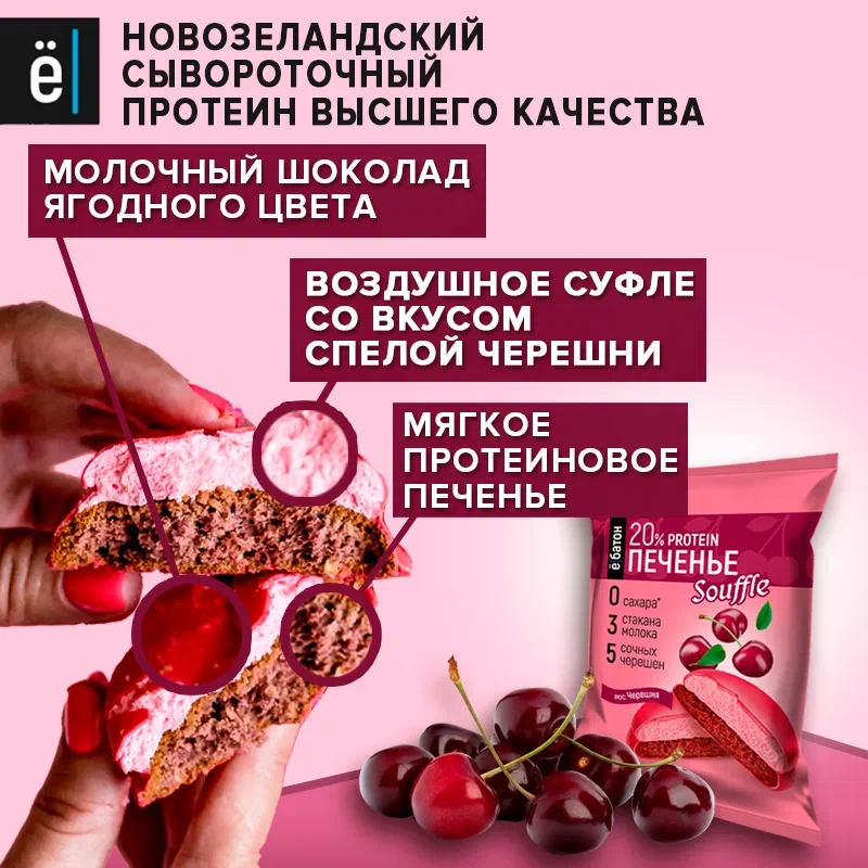 Протеиновое печенье ё/батон с белковым суфле 20% белка, черешня, 9 шт по 50 г