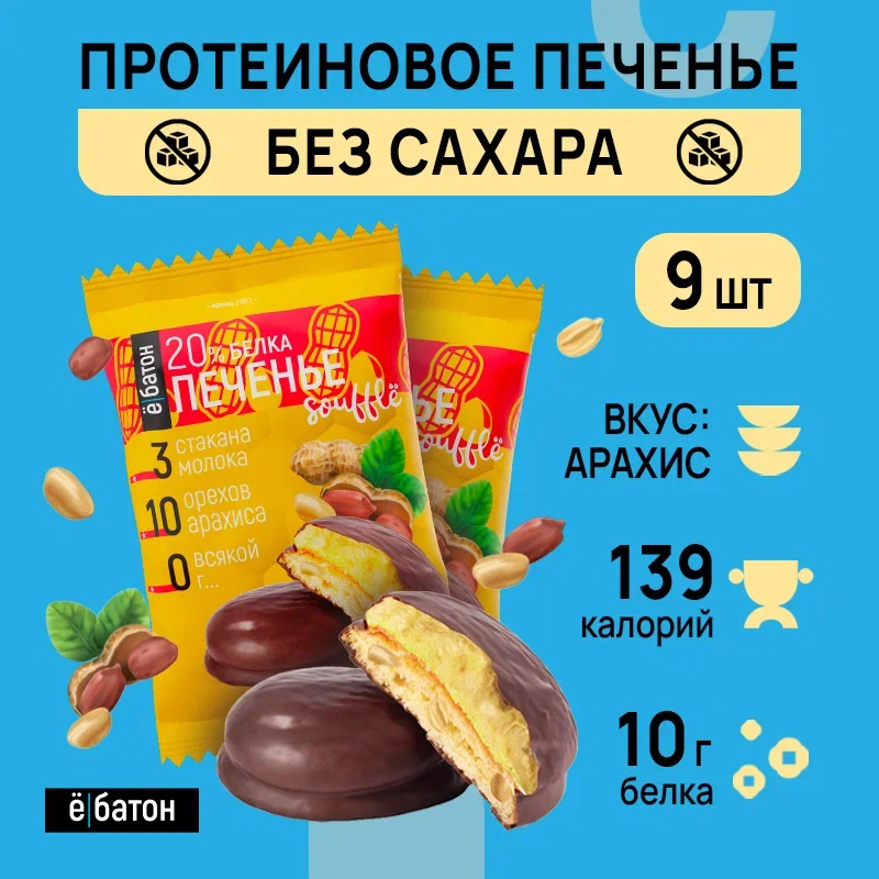 Протеиновое печенье ё|батон с белковым суфле и с арахисом, без сахара 9 шт по 50 г