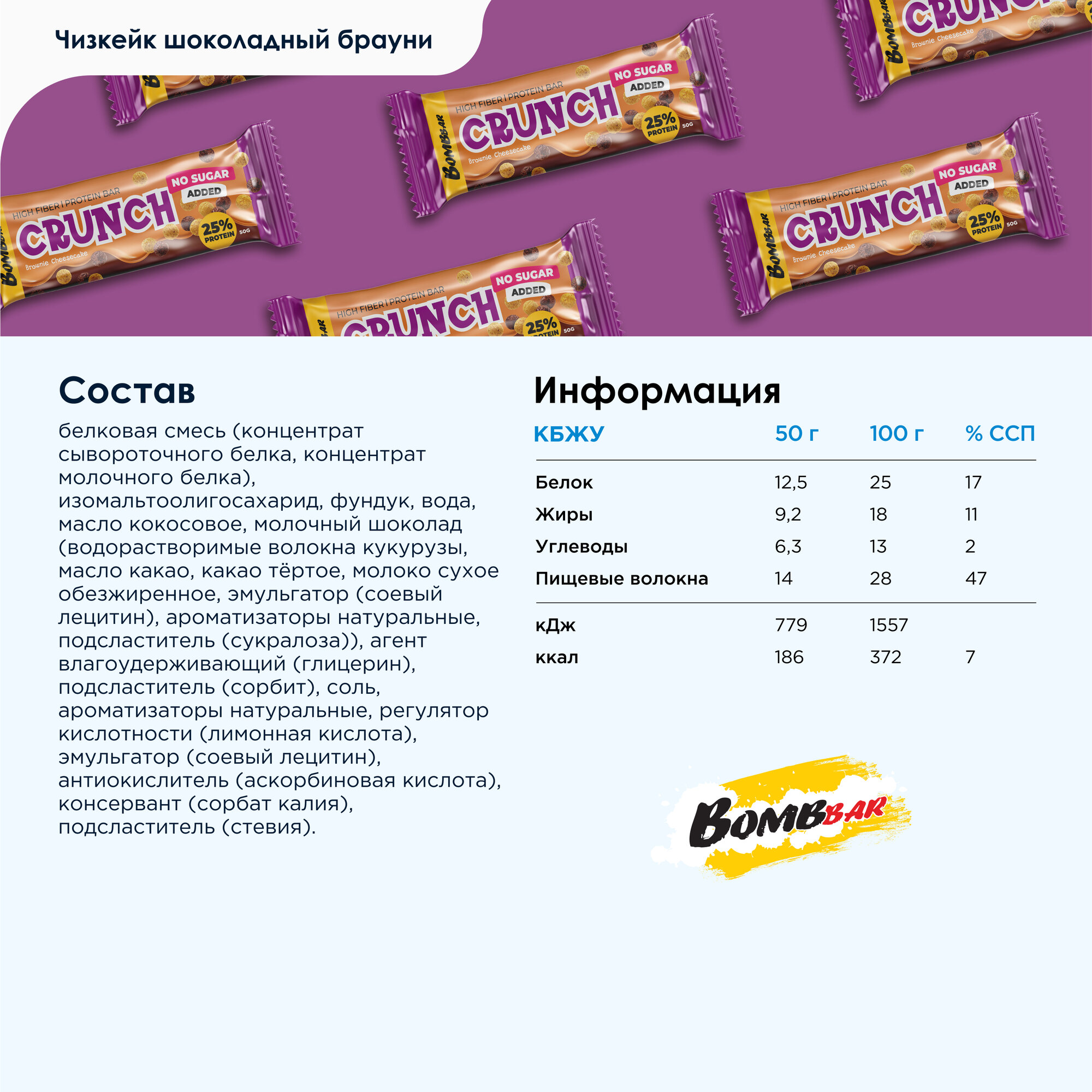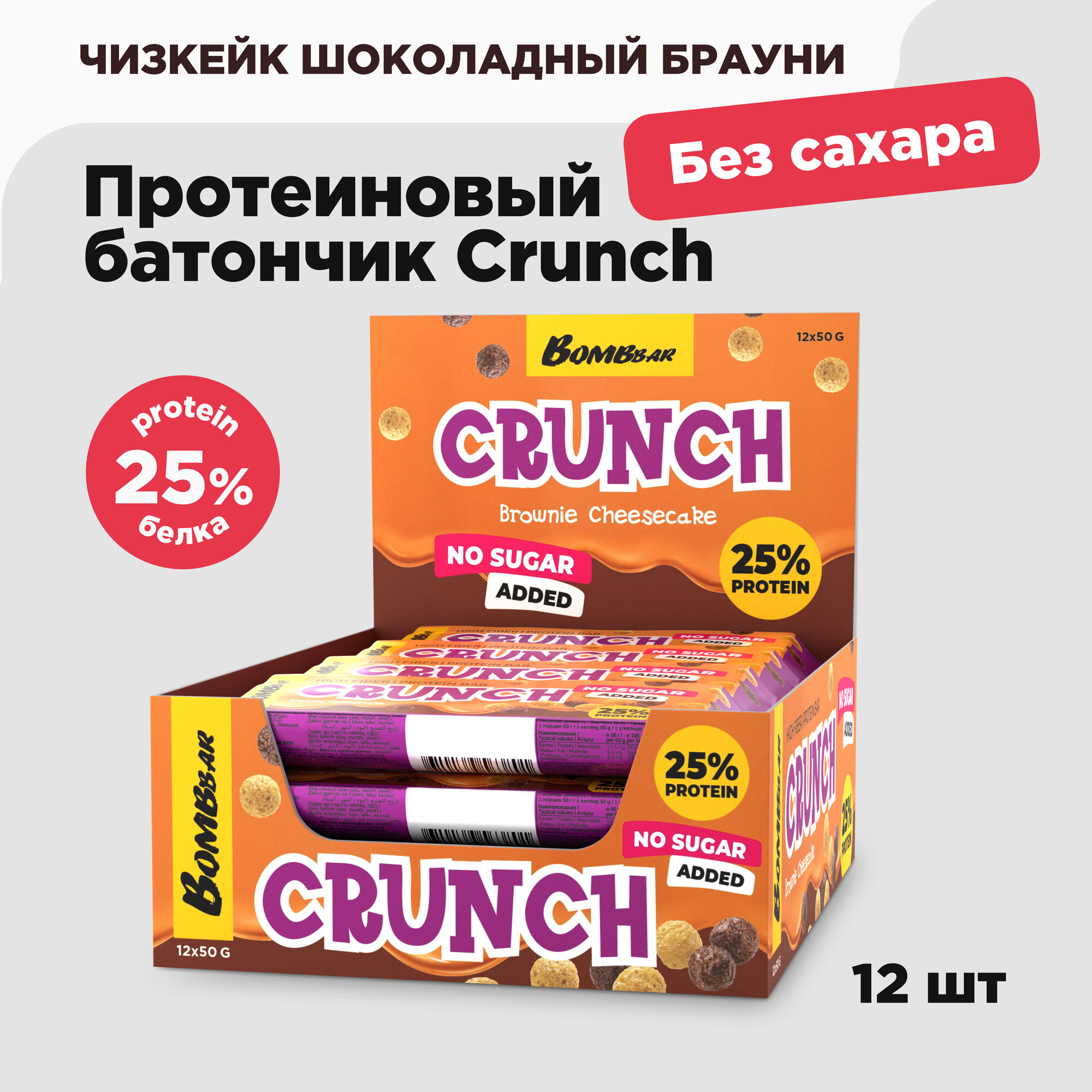 Bombbar Протеиновые батончики без сахара в шоколаде Crunch "Брауни чизкейк", 12шт х 50г интересное:
