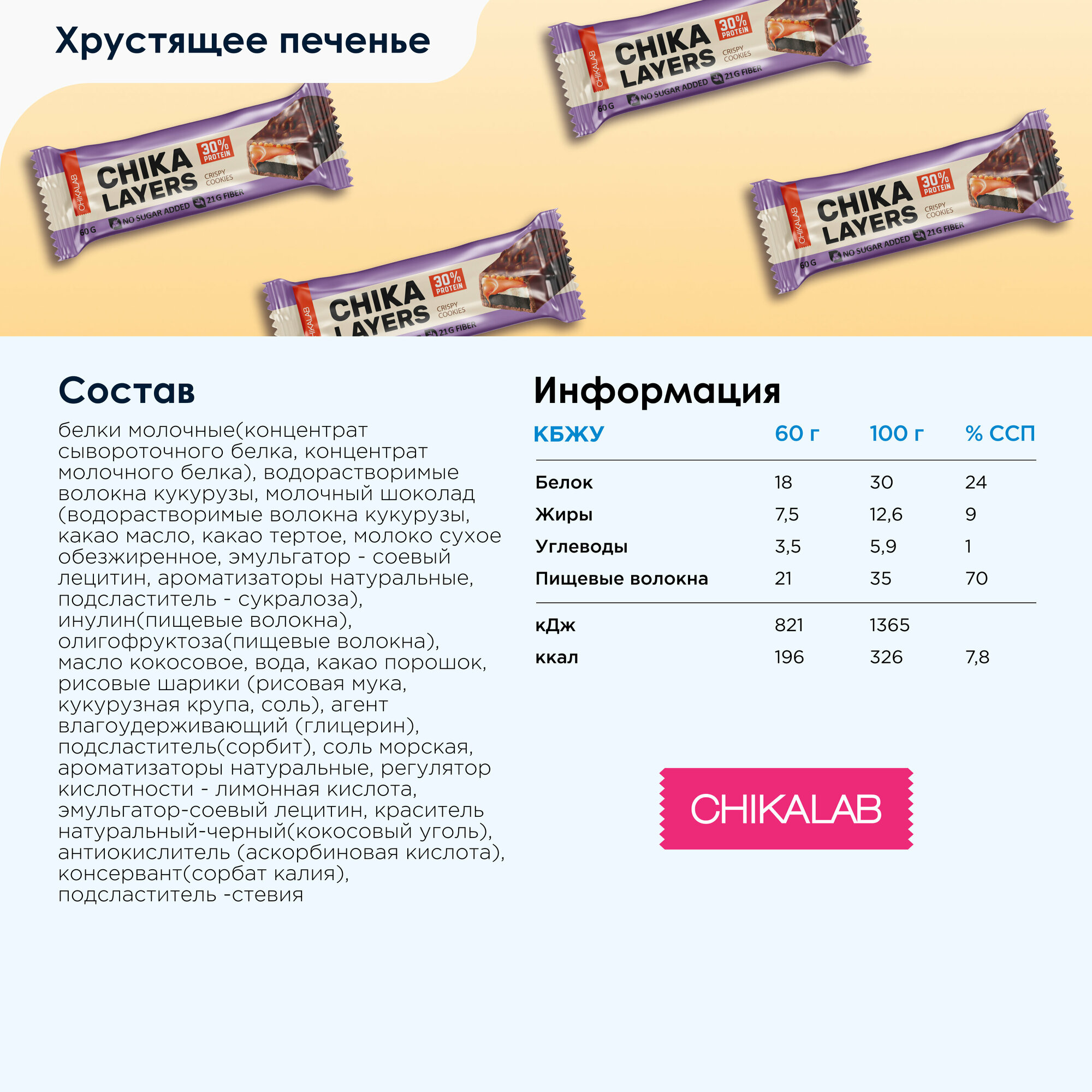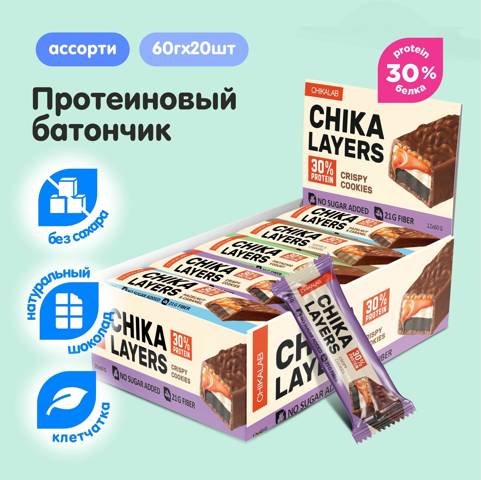Протеиновый батончик CHIKALAB ChikaLayers, Хрустящее печенье (20шт по 60г)