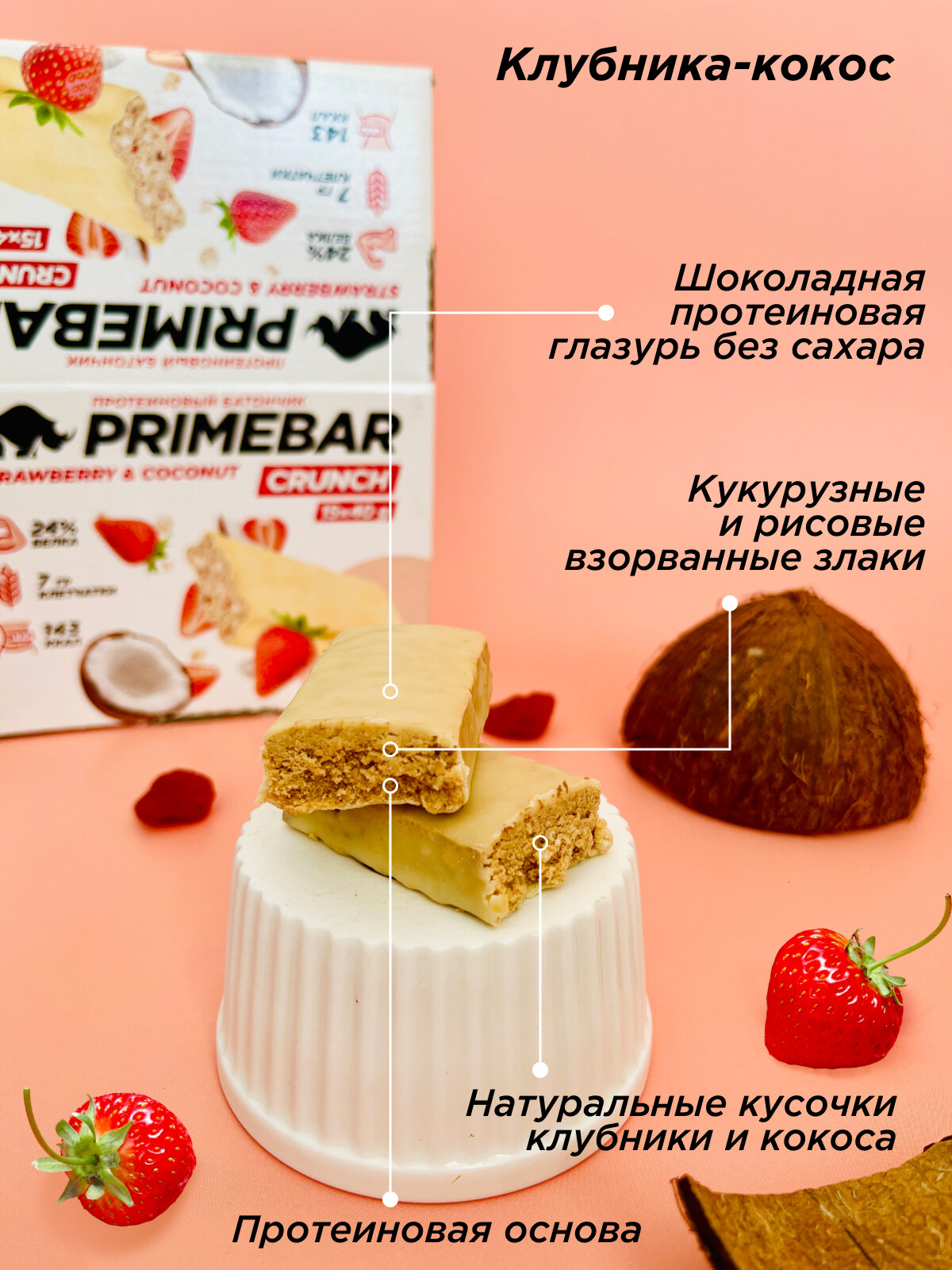 СохранитьПротеиновые батончики без сахара WOWBAR Crunch Клубника-кокос, 15 шт * 40 гр / спортивное питание / снеки интересное: