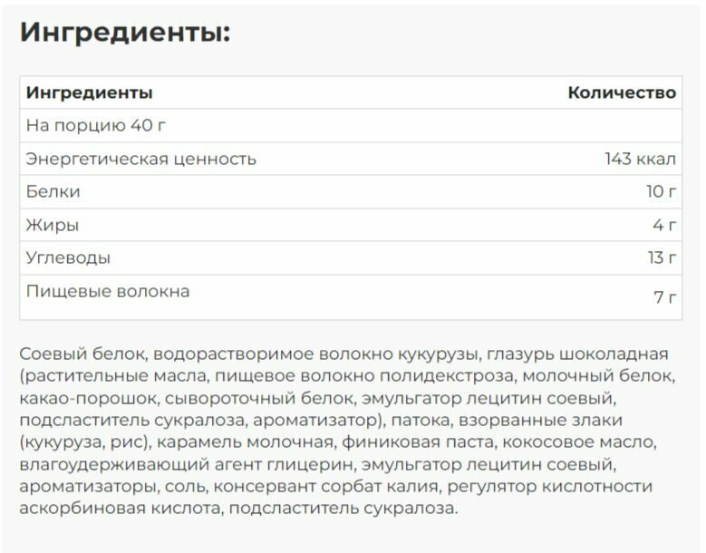 | Дополнительная информация | Пищевые волокна 17 гр/100 гр; назначение: Восстановление, насыщение белком, снижение аппетита, обогащение витаминами организма; рекомендации по применению: Употреблять не более 2-х штук в сутки; форма выпуска: батончик; состав: соевый белок, водорастворимое волокно кукурузы, глазурь шоколадная (растительные масла, пищевое волокно полидекстроза, молочный белок, какао-порошок, сывороточный белок, эмульгатор лецитин соевый, подсластитель сукралоза, ароматизатор), патока, взорванные злаки (кукуруза, рис), карамель молочная, финиковая паста, кокосовое масло, влагоудерживающий агент глицерин, эмульгатор лецитин соевый, ароматизаторы, соль, консервант сорбат калия, регулятор кислотности аскорбиновая кислота, подсластитель сукралоза |