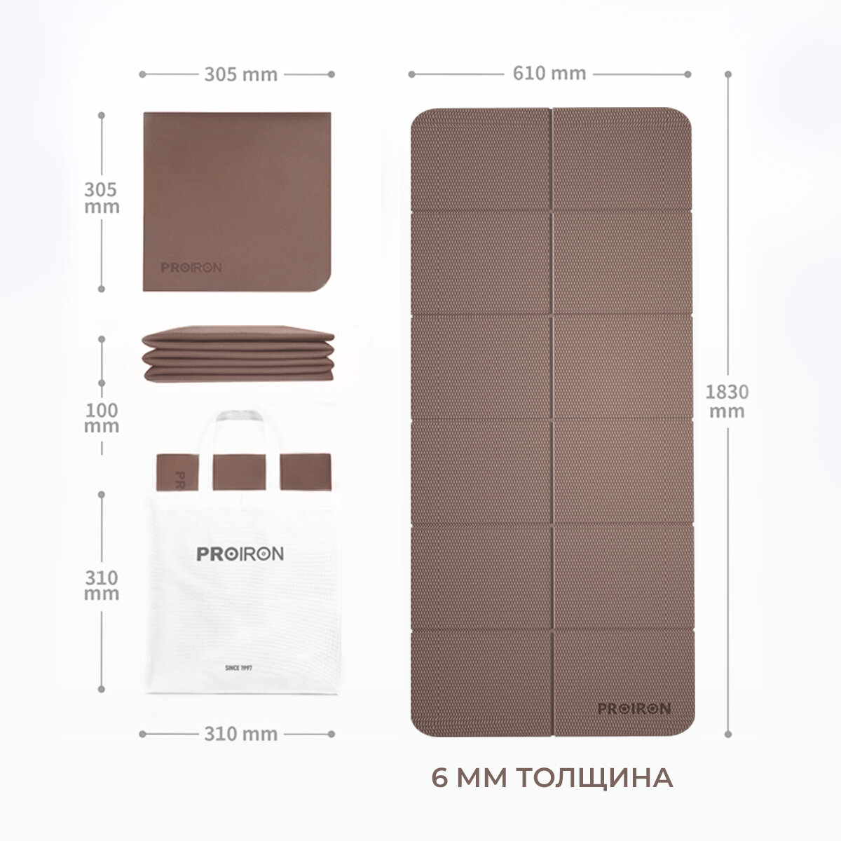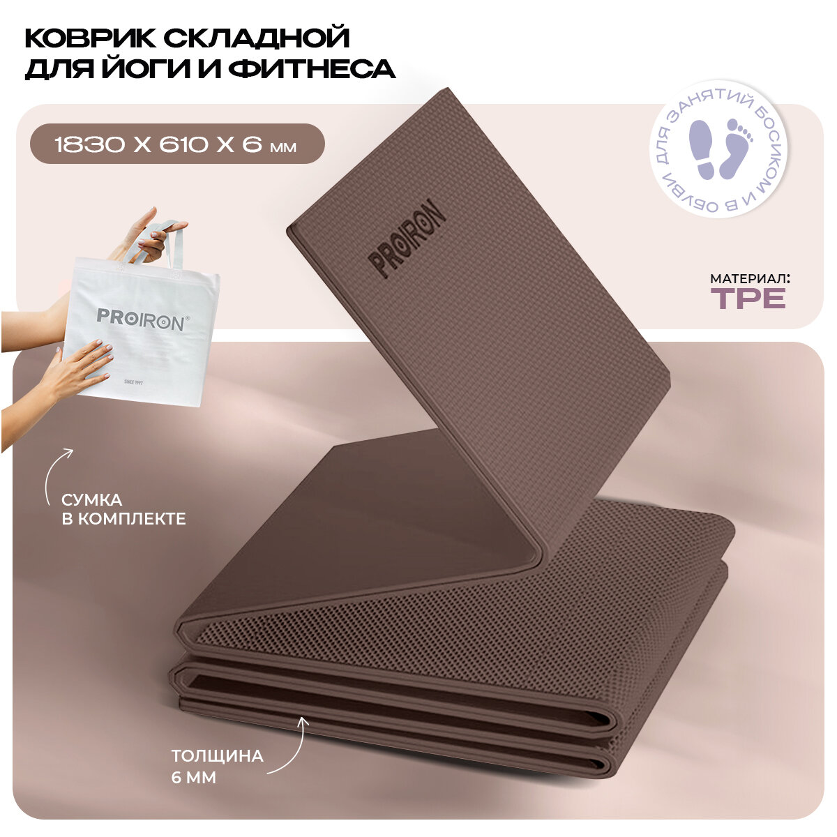 Купить Коврик для фитнеса и йоги нескользящий складной PROIRON, размеры 1830х610х6 мм, материал TPE, кофейный