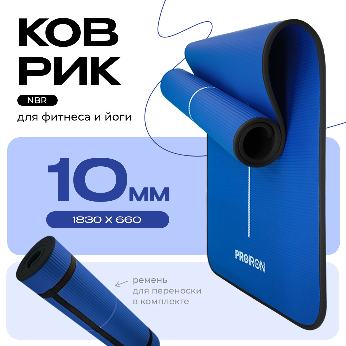Коврик для фитнеса и йоги нескользящий PROIRON, размеры 1830*660*10мм, материал NBR, синий интересное: