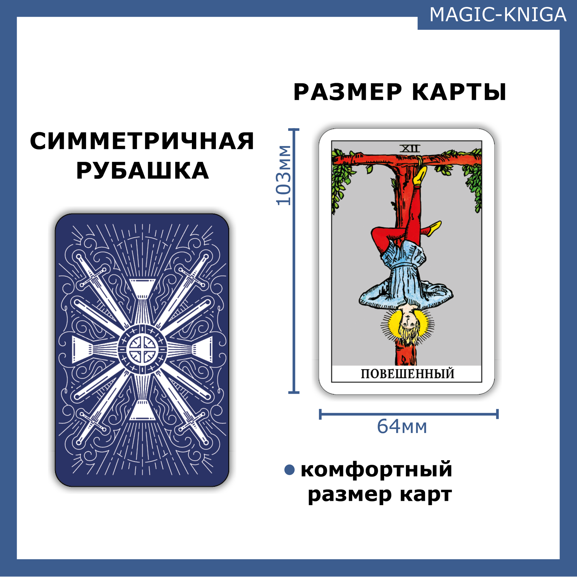 | Подробная комплектация | 78 карт для гадания размером 10,3х6,4 см, книга инструкция 120 страниц, 6 карт с раскладами, коробка с крышкой для хранения |