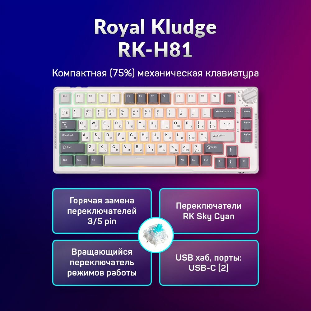 Компактная (75%) механическая клавиатура Royal Kludge RK-H81 - 3 типа подключения, 81 клавиша, Gasket Mount, White Night переключатели RK Sky Cyan