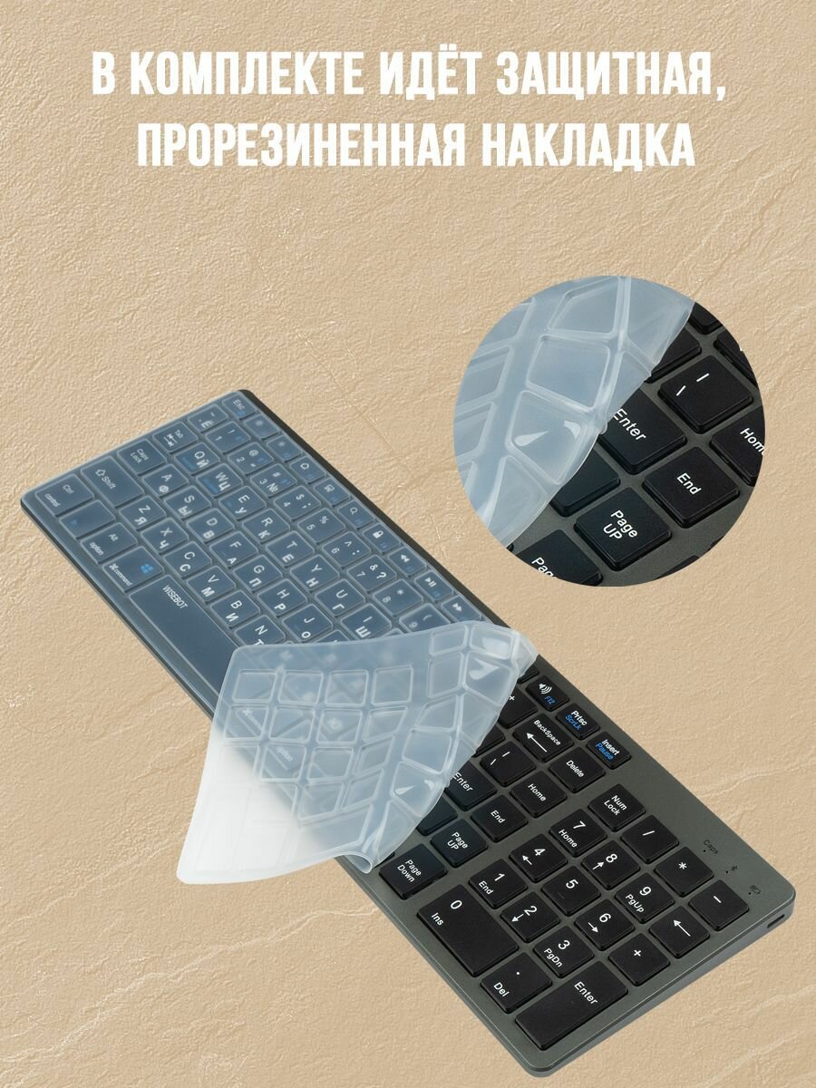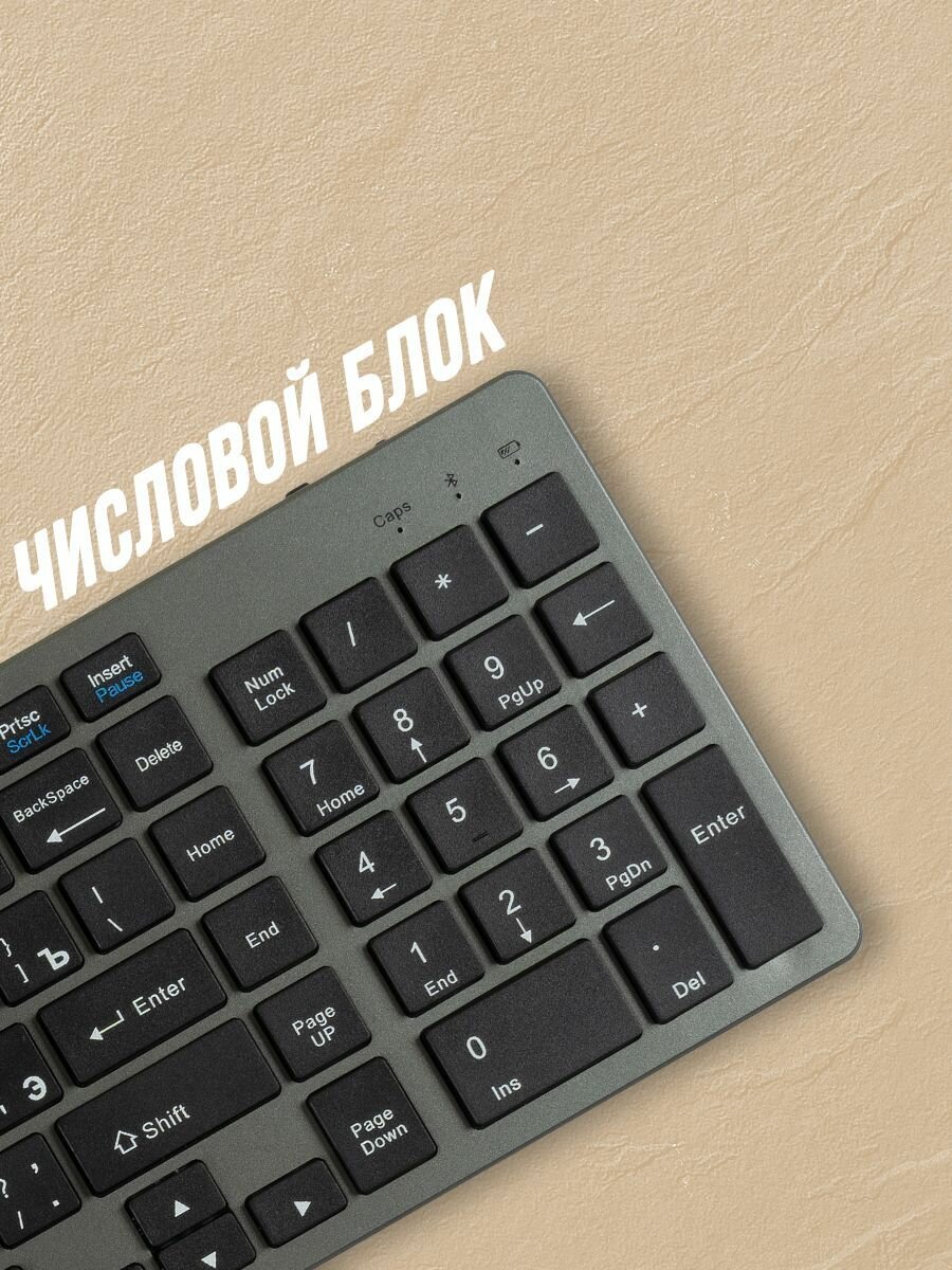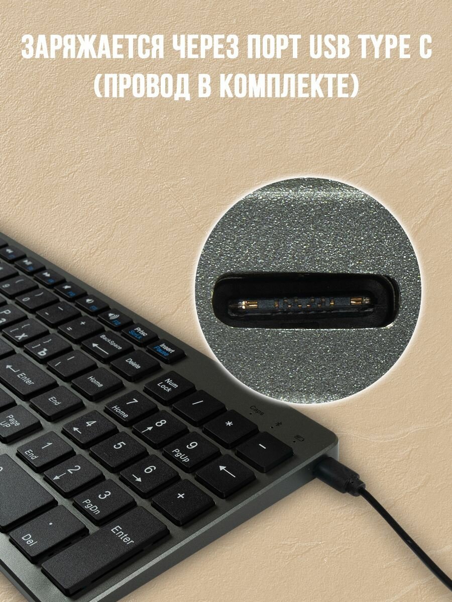 Клавиатура беспроводная, заряжаемая, полноразмерная, с подключением через блютус или USB-приемник, серая интересное: