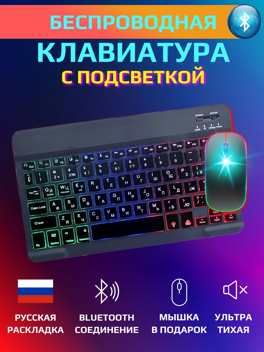 Беспроводная компактная Bluetooth клавиатура с подсветкой и мышкой с адаптером русская раскладка