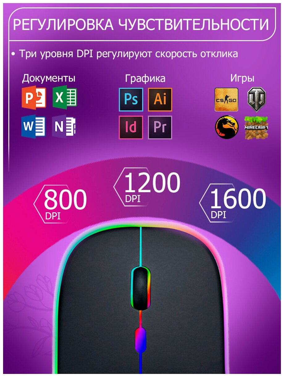 Мышь компьютерная беспроводная, игровая мышка с подсветкой, черная интересное:
