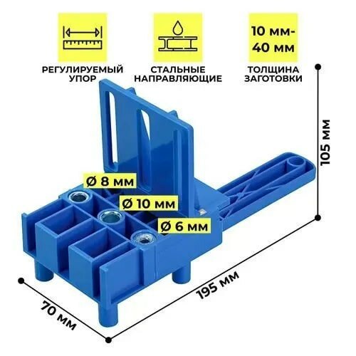 | Подробная комплектация | Кондуктор 1 шт Набор сверл 3 шт Ограничитель глубины 3 шт Шестигранник 1 шт Адаптер для кондуктора 1 шт |