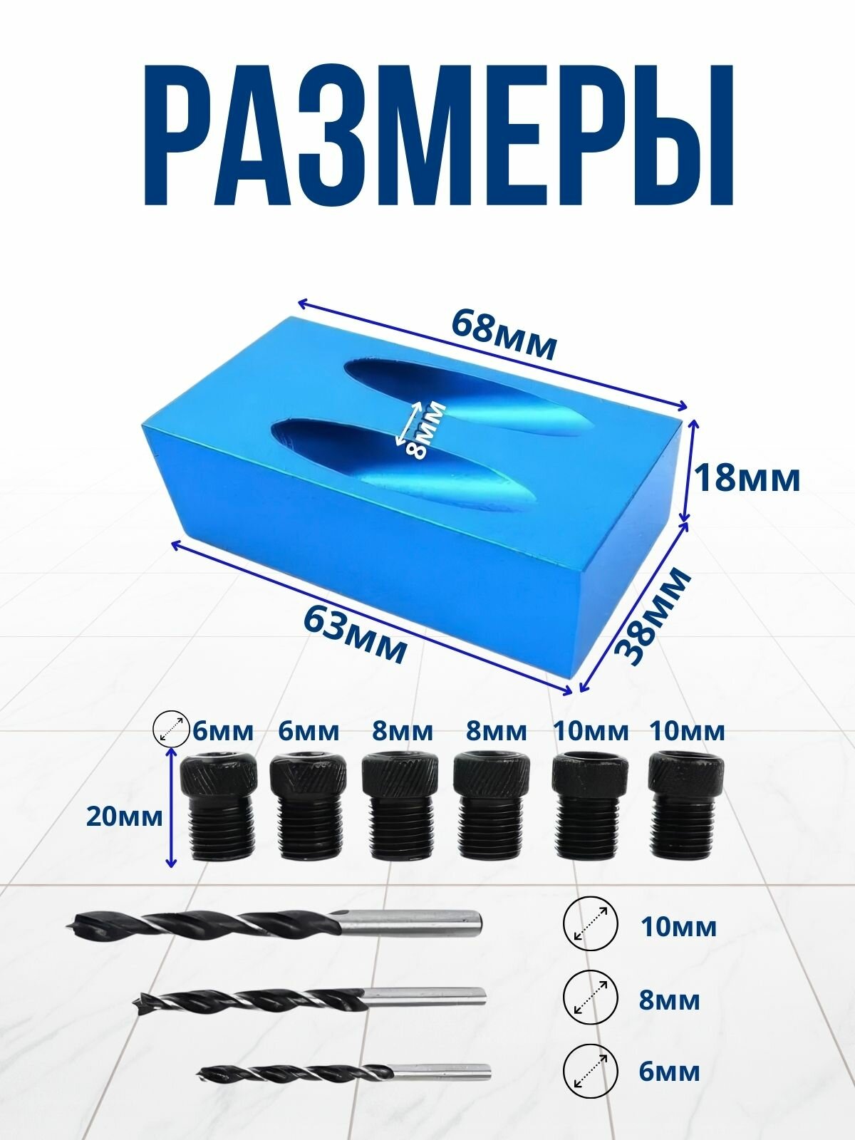 | Подробная комплектация | Кондуктор для сверления "косой шуруп" двух канальный / сверла по дереву 6-8-10мм / направляющие болты 2 шт. на 6мм, 2 шт. на 8мм, 2 шт. на 10мм / шестигранный ключ |