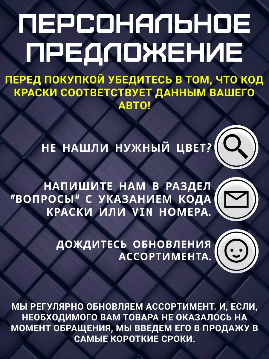 | Дополнительная информация | 1. Ремонтируемый участок отчистить от грязи и ржавчины, обезжирить. 2. При необходимости обработать преобразователем ржавчины, сушка 15-20 мин. 3. Протереть салфеткой или чистой ветошью. 4. Нанести грунт. Время сушки 20 мин. 5. Нанести ремонтную краску. Время сушки 5-7 мин. 6. Нанести лак. Время сушки 15-20 мин. ВНИМАНИЕ!!! Время сушки указано для температуры окружающей среды 15-25 градусов Цельсия. При более низких температурах оно увеличивается!!!! |