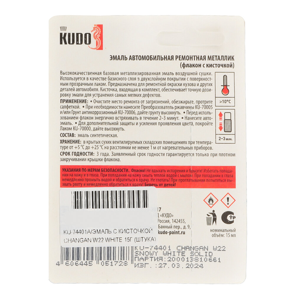 Эмаль автомобильная с кисточкой KUDO CHANGAN W22 SNOWY WHITE SOLID 15 гр Ku-74401