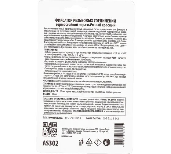 Фиксатор резьбы неразъёмный термостойкий красный 10 мл. AS302 AXIOM