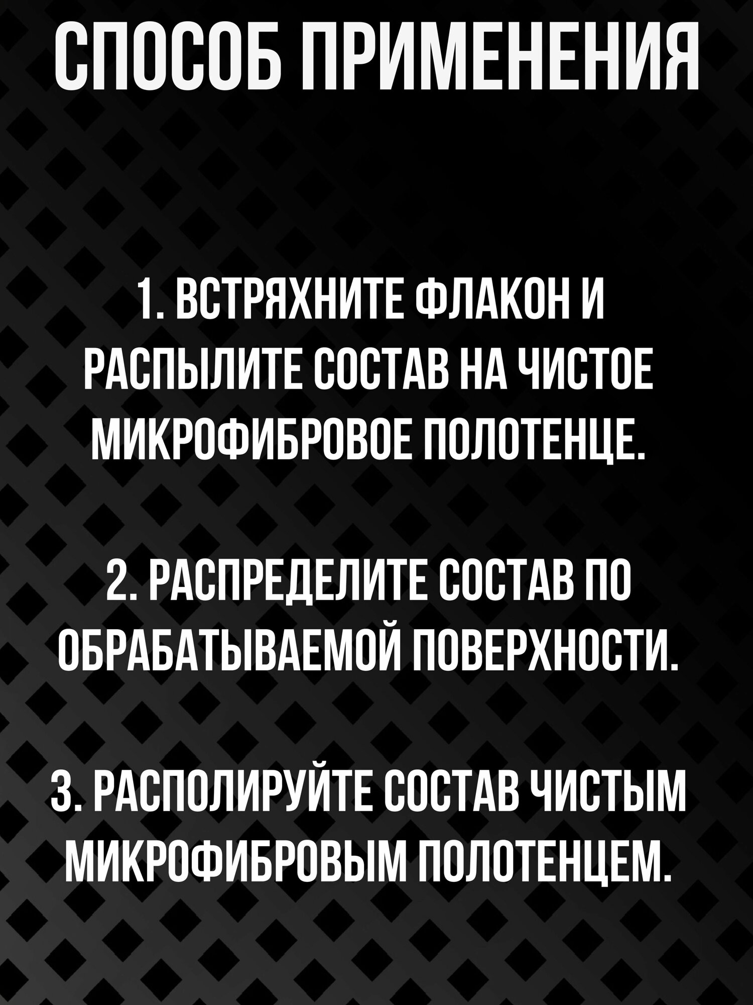 | Способ применения | встряхните флакон и распылите состав на чистое микрофибровое полотенце.; Распределите состав по обрабатываемой поверхности.; Располируйте состав чистым микрофибровым полотенцем. |