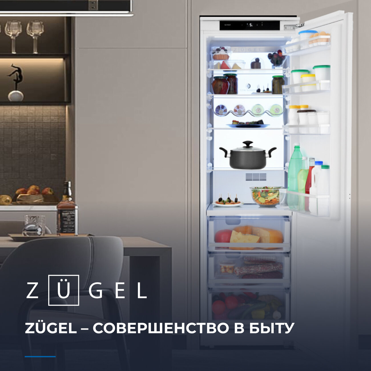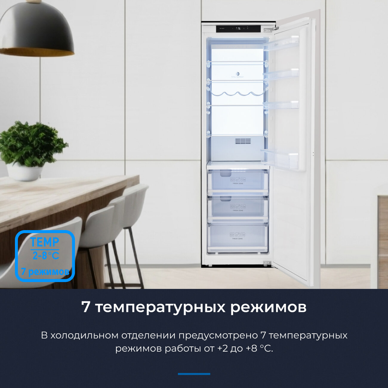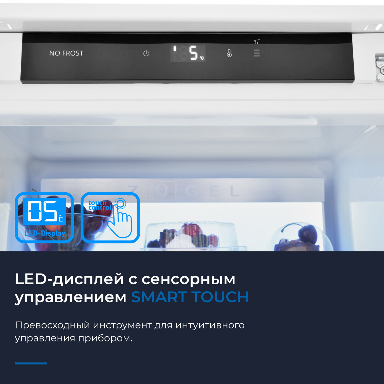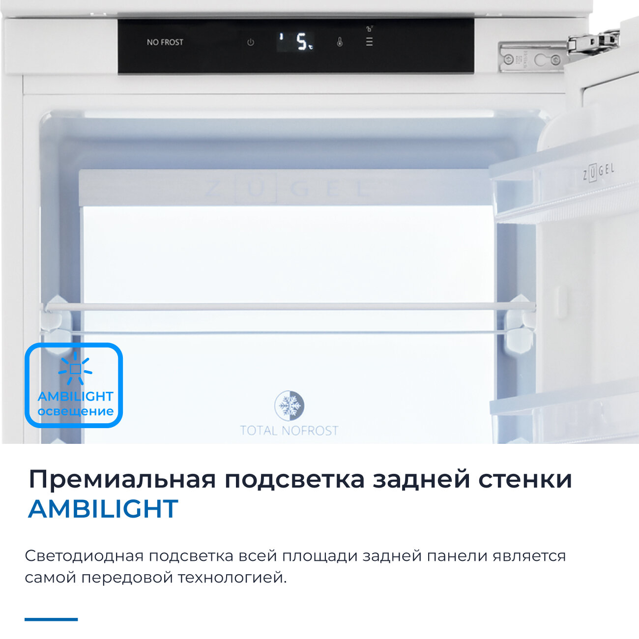 Холодильник однокамерный встраиваемый ZUGEL ZRI1750NF, класс энергопотребления A+, 281 л, Full No Frost, режим Суперохлаждение, LED-подсветка AMBILIGHT, белый