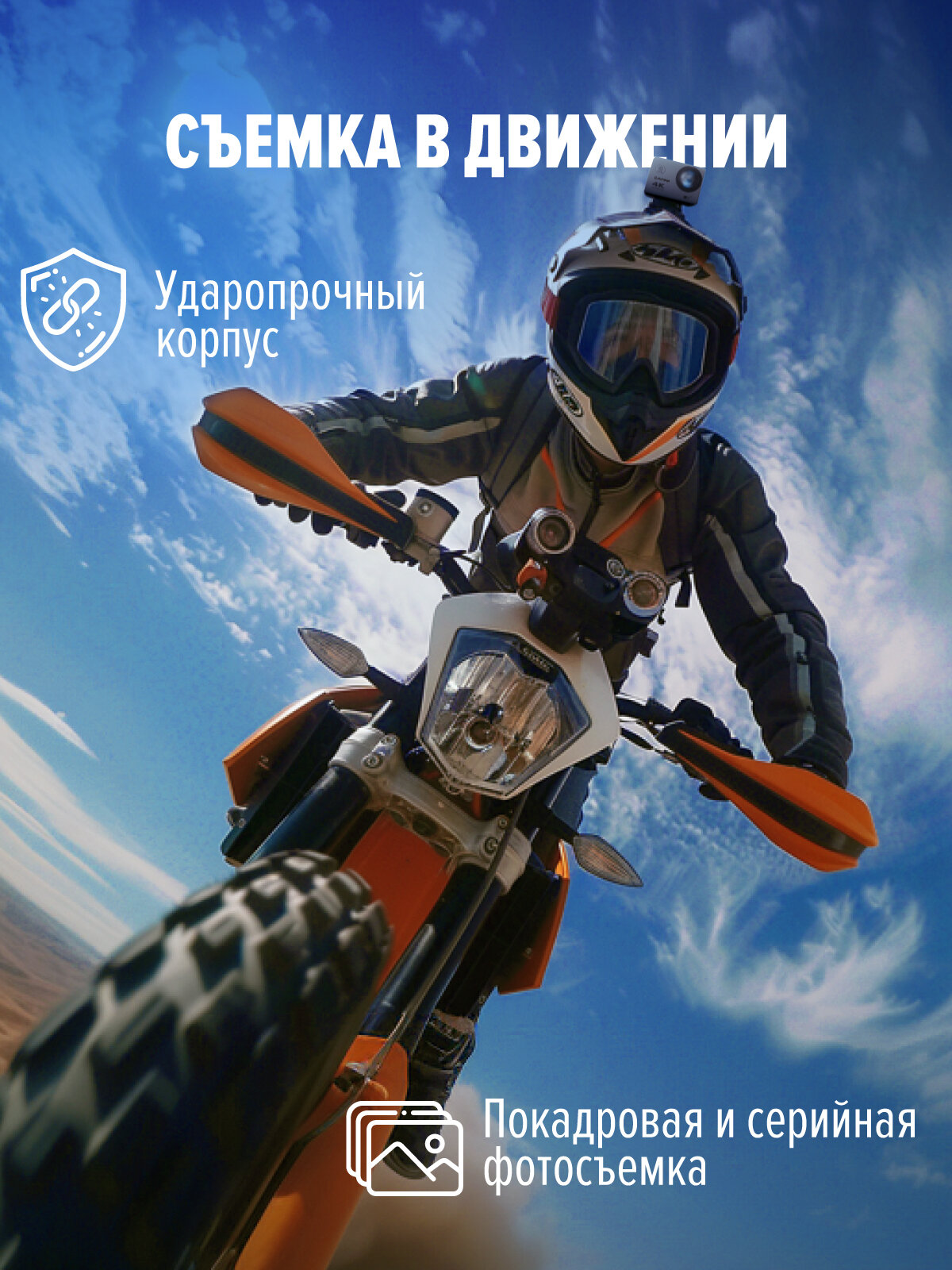 | Комплектация | камера со встроенной батареей, 1 водонепроницаемый бокс, 1 крепление на велосипед, 1 клипса крепления, 1 крепление на шлем, 3 ремешка, 1 держатель, 1 браслет для ношения на запястье, 1 кабель зарядки, 1 инструкция на русском языке, 1 пульт ДУ, 1 комплект тряпочек |