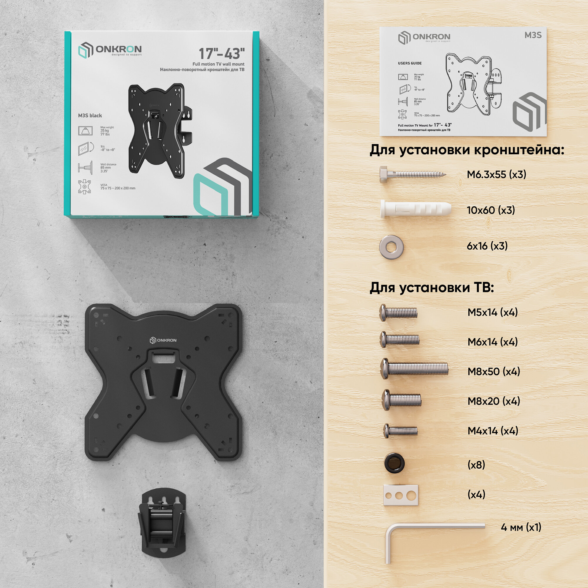 Кронштейн на стену для телевизора 17"- 43" ONKRON M3S, наклонно-поворотный, до 35 кг, черный
