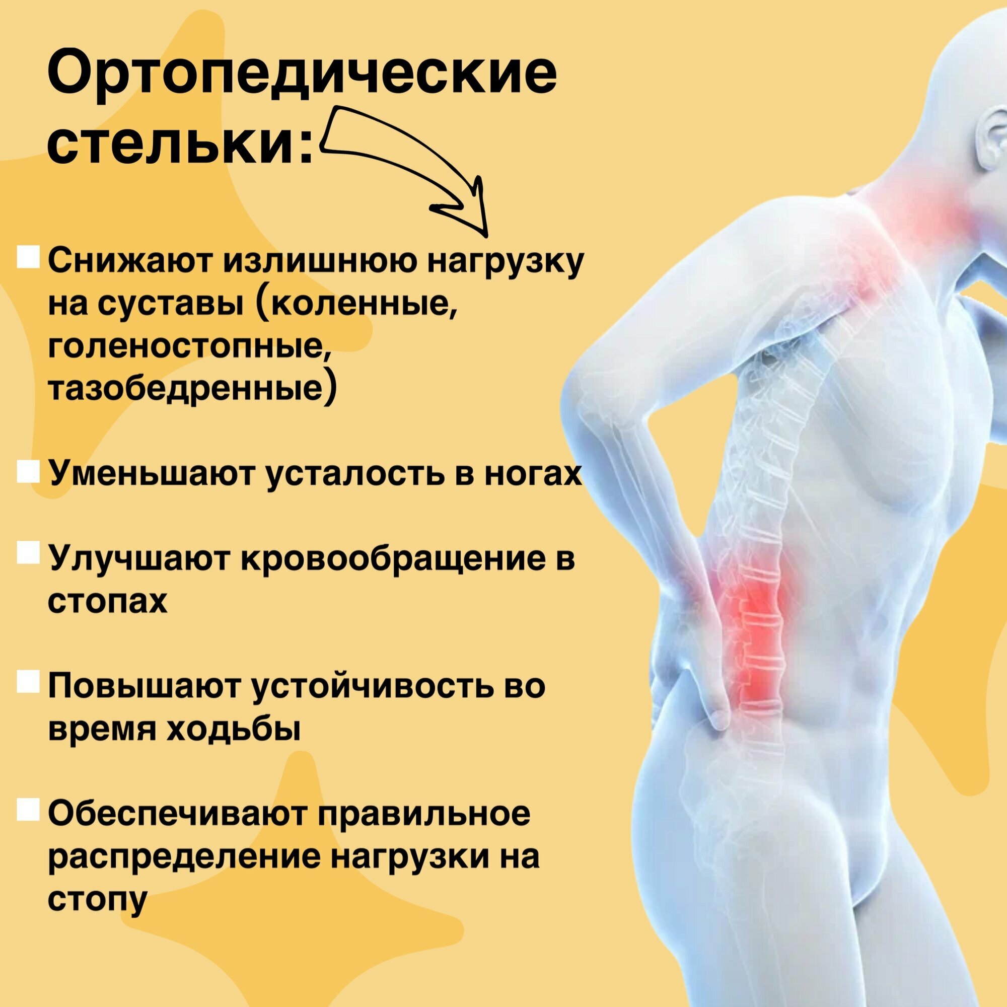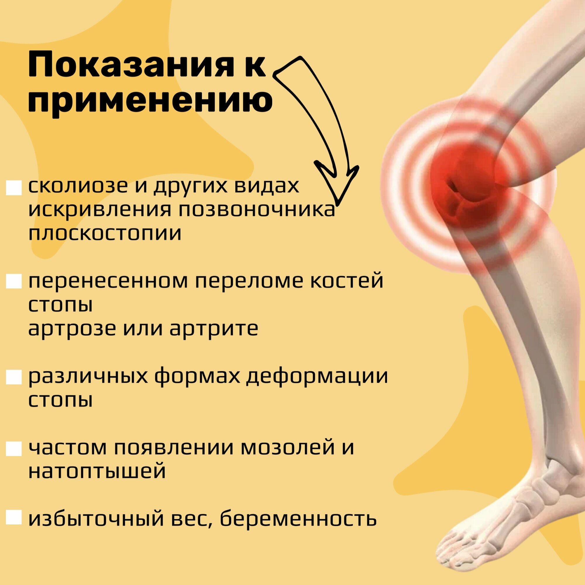 | Показания | искривление позвоночника / лишний вес / натоптыши / повышенная нагрузка на ноги / полая стопа / поперечное плоскостопие / продольно-поперечное плоскостопие / продольное плоскостопие / пяточная шпора |