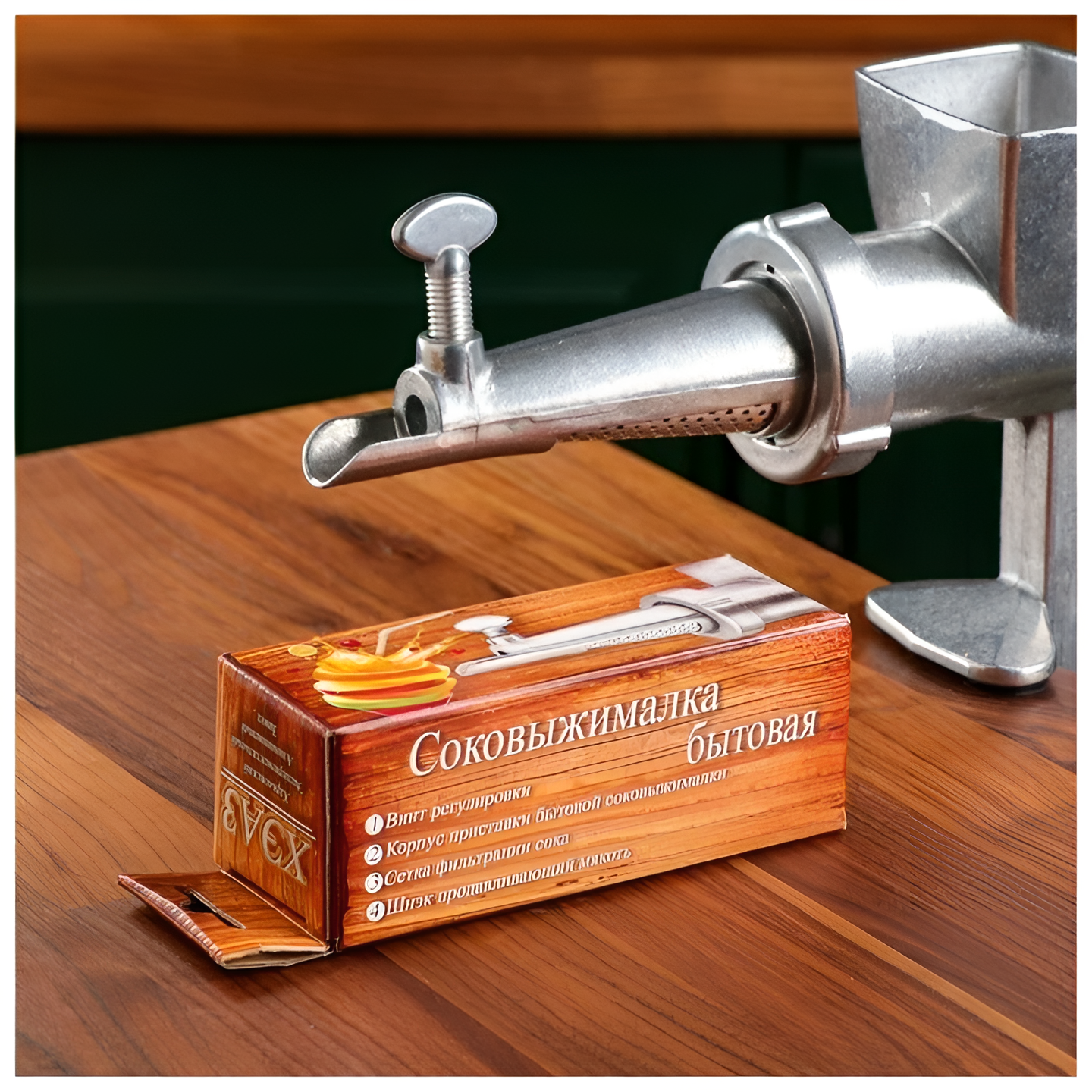 | Дополнительная информация | Установка: Убирать нож и решетку с ручной мясорубки. Надеть гайку на насадку-соковыжималку и закрутить на мясорубку. |