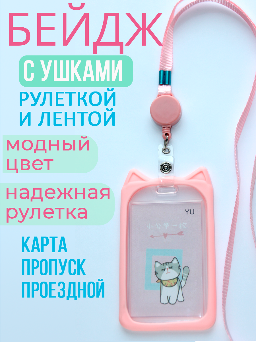 СохранитьБейдж с ушками Котик в силиконовой оправе, для пропуска, чехол для карты, с рулеткой на ленте, для аниме-карточки, для школьной карты. Детский. Розовый. интересное: