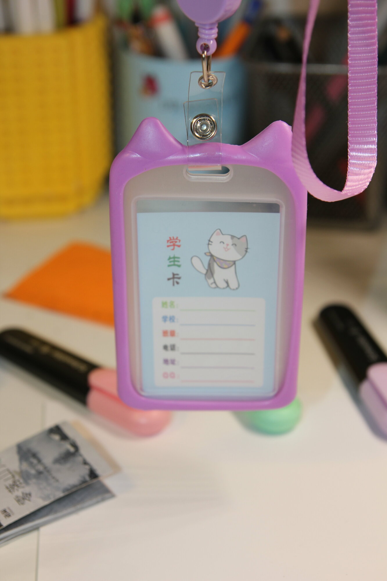 СохранитьБейдж с ушками Котик в силиконовой оправе, для пропуска, чехол для карты, с рулеткой на ленте, для аниме-карточки, для школьной карты. Детский. Фиолетовый. интересное:
