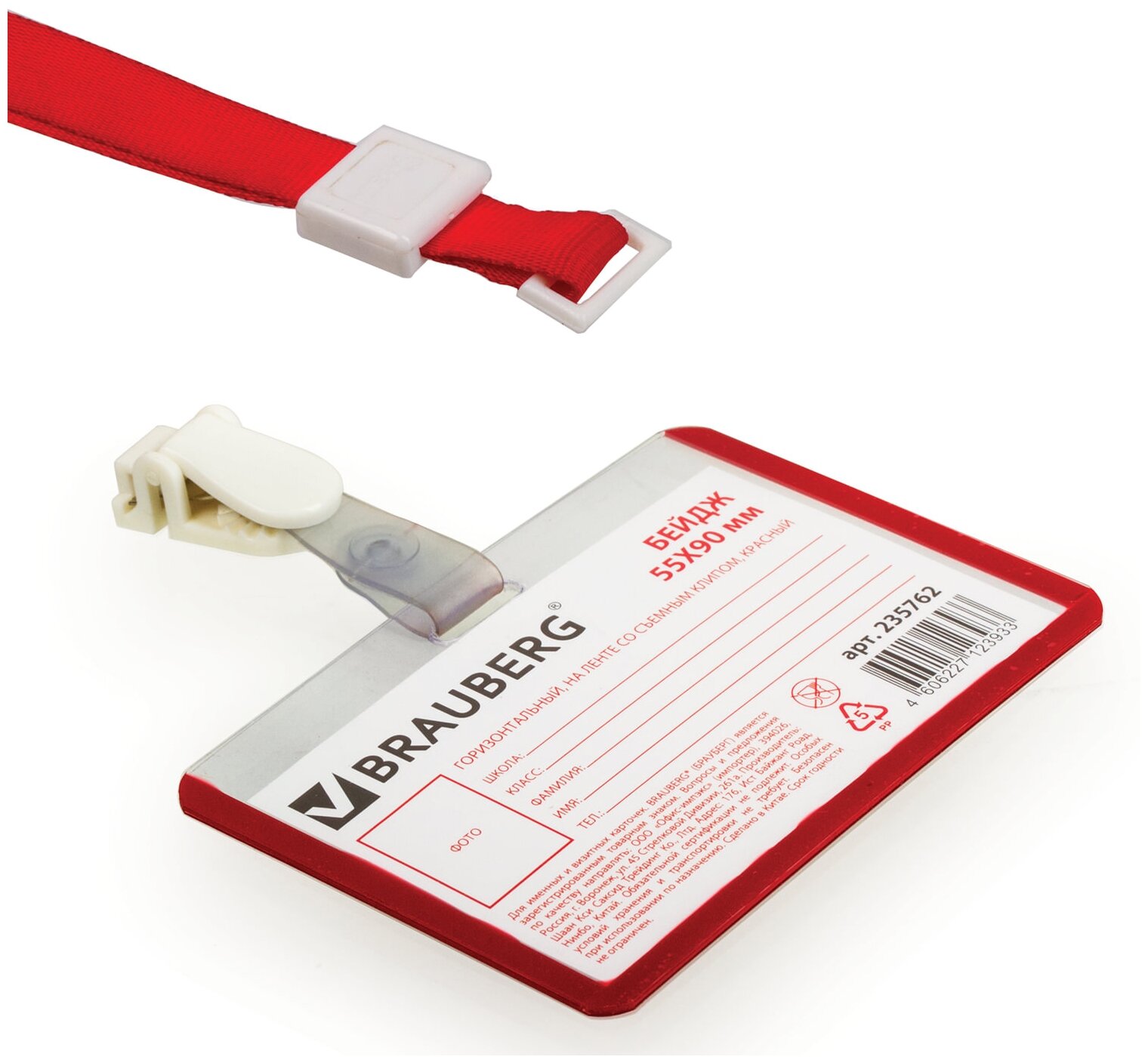 Бейдж школьника горизонтальный (55х90 мм), на ленте со съемным клипом, красный, BRAUBERG, 235762