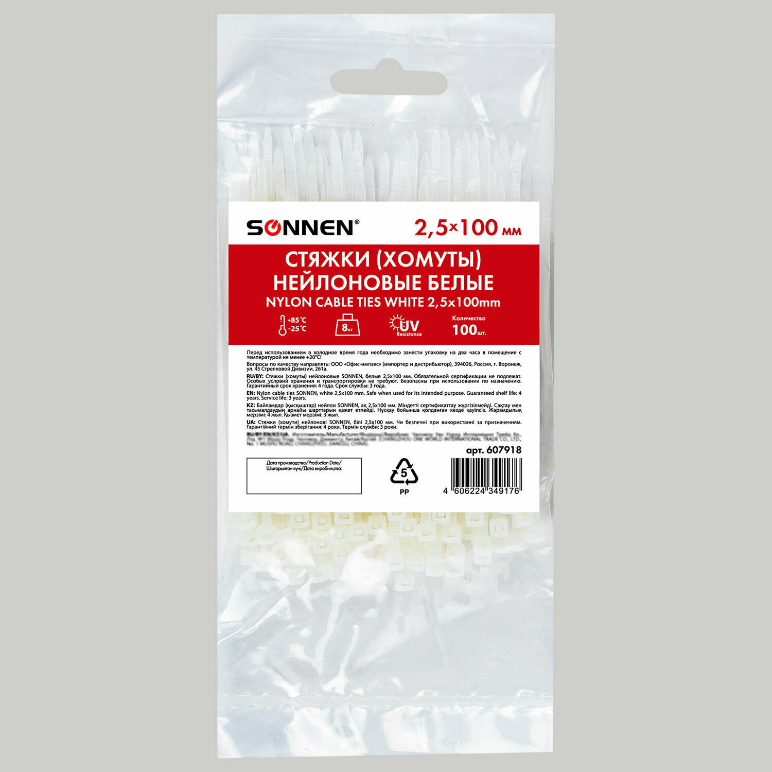 Купить Хомут стяжка для проводов / кабелей нейлоновый (кабельная стяжка) сверхпрочная Power Lock, 2,5х100мм, 100 штук, белая Sonnen, 607918