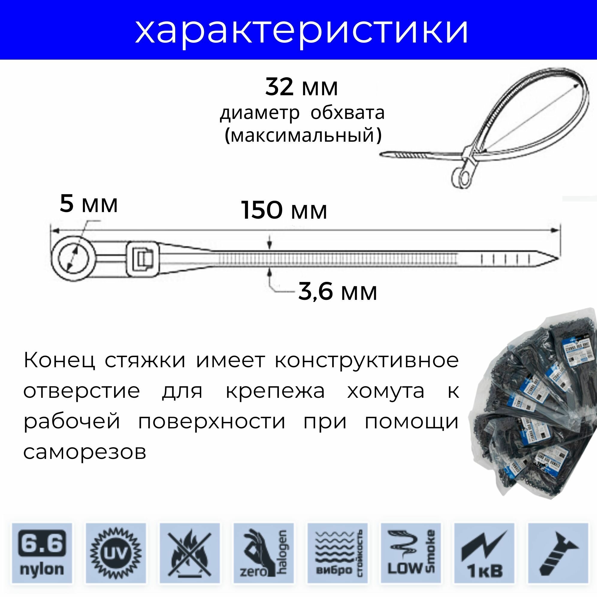 Купить Стяжки пластиковая Elestarpro под винт (саморез) 3.6мм x 150мм, в упаковке 100 шт. черная