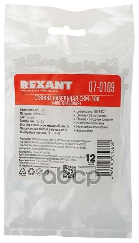 Хомут-стяжка нейлоновый многоразовый Rexant 100x2.5 мм, белый, 100 шт./упак.