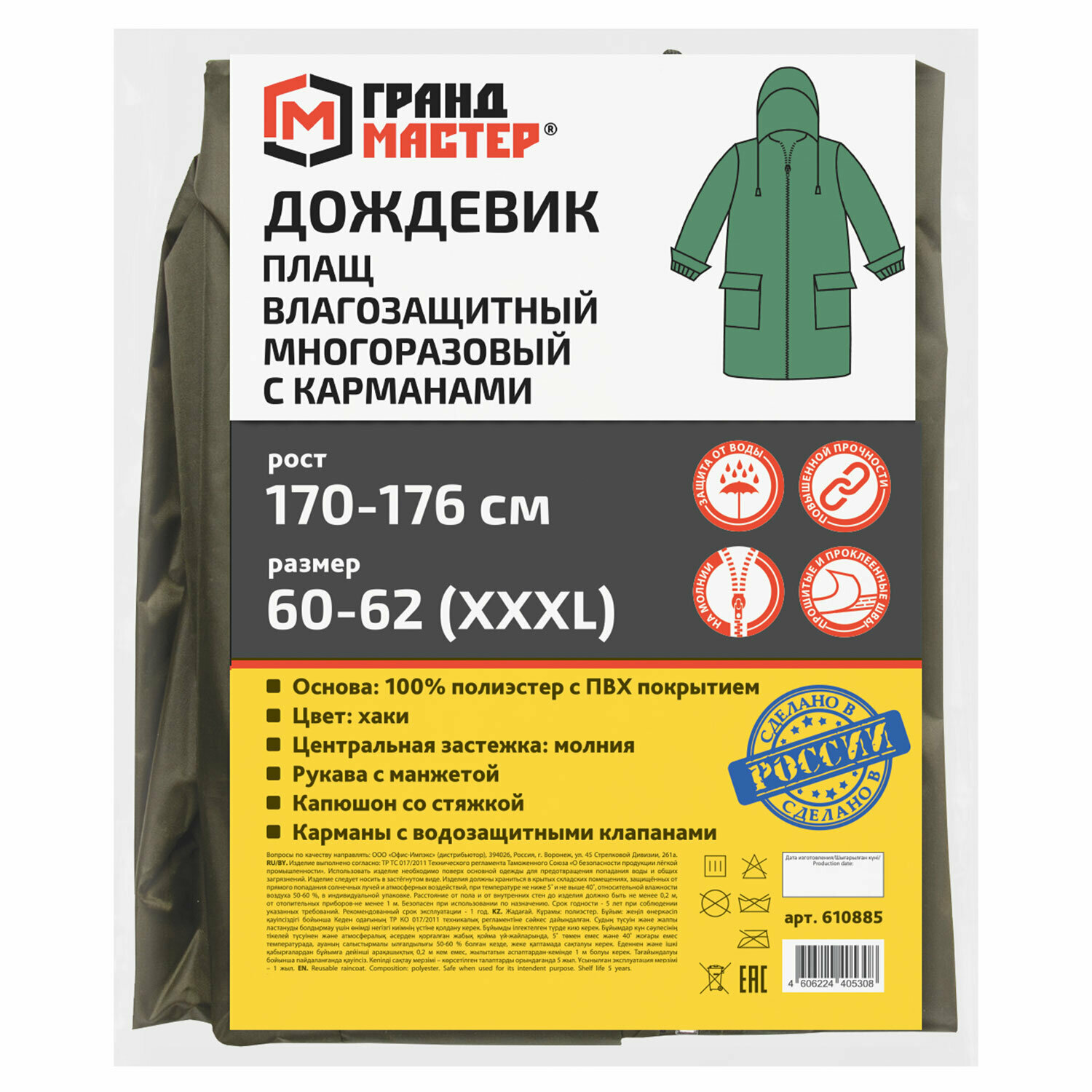 Дождевик плащ хаки С карманами многоразовый на молнии, размер 60-62, рост 170-176, грандмастер, 610885 интересное: