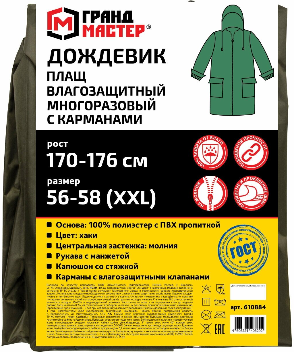 Дождевик плащ хаки С карманами многоразовый на молнии, размер 56-58, рост 170-176, грандмастер, 610884 интересное: