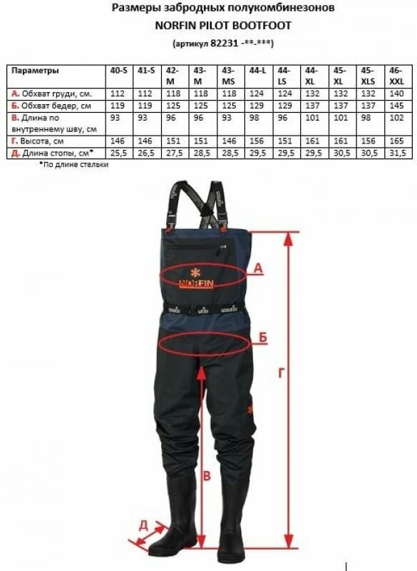 СохранитьПолукомбинезон забродный Norfin PILOT BOOTFOOT р.44-L с сапогами резина (82231-44-L) интересное: