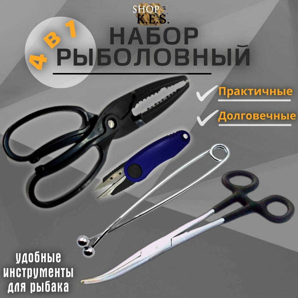 Захват челюстной, ножницы перекусы, экстрактор щипцы, зевник в комплекте / Набор рыболовный 4в1