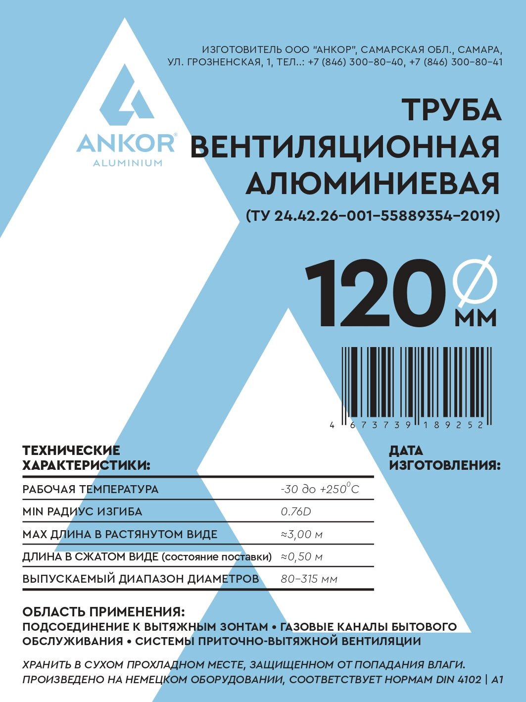 Воздуховод гофрированный алюминиевый "Анкор", диаметр 120мм, длина 3 метра