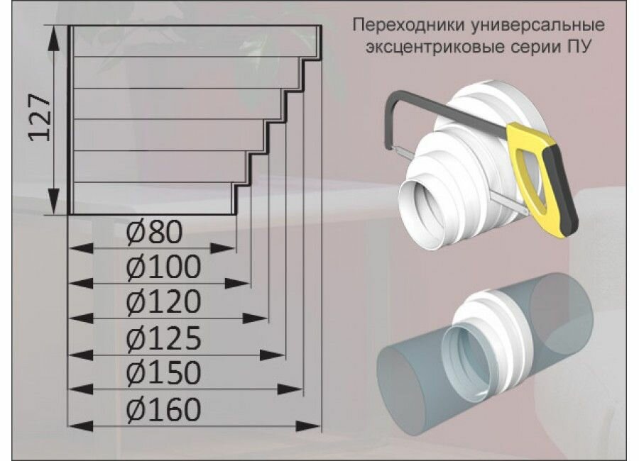 СохранитьПереходник универсальный экцентрик 80 / 100 / 120 / 125 / 150 мм, редуктор многоступенчатый, 3 шт, 310-3, белый, воздуховод, ПВХ интересное: